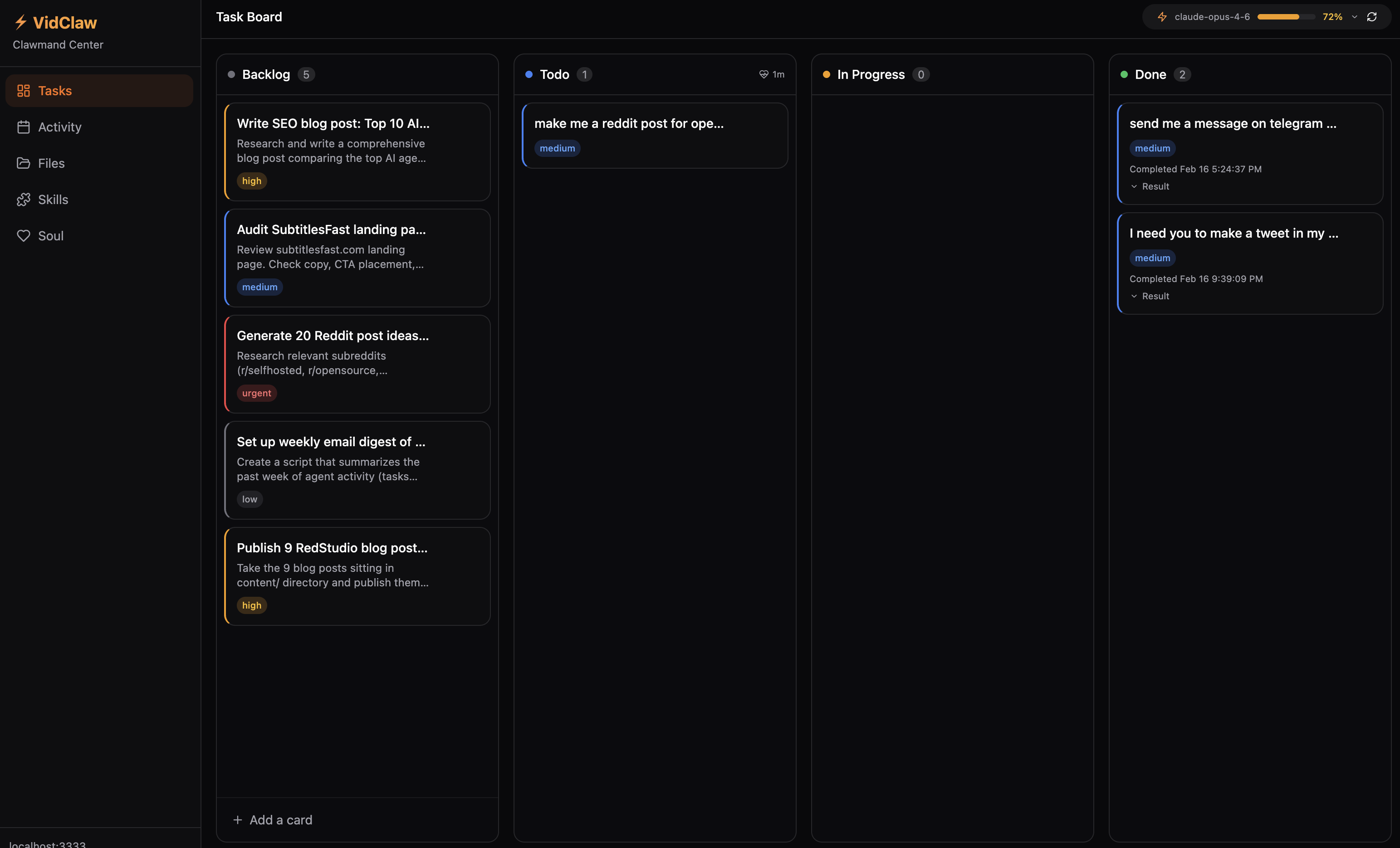 介绍:我在OpenClaw上运行了一个AI助手,负责SEO跟踪、内容创作、代码任务等等。仅通过聊天管理它变得有些混乱。于是,我需要一个可视化的任务队列,能够看到助手在做什么,跟踪我的开销,并且可以调整它的个性,而不必通过SSH编辑文件。VidClaw就是这样一个仪表盘。它简洁明了,专为真正使用AI助手的人设计,而不仅仅是用来讨论这些工具。它是100%自托管的,你的数据也始终保存在你的服务器上。