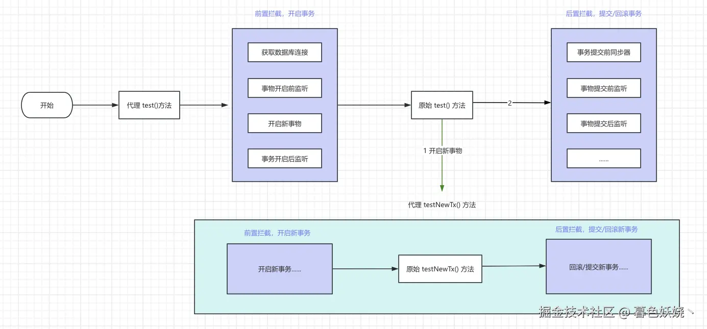 Spring 注解事务的核心就是对不同的传播行为或者说对事务嵌套进行处理,因为关系型数据库 MySQL 是不支持事务嵌套的,假如我们在 MySQL 客户端开启事务之后,再次执行 Begin,那么它会先提交当前事务然后重新开启新事务