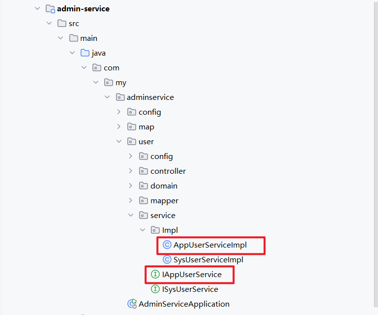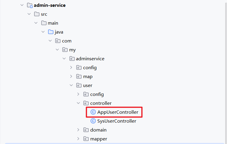 ● 根据一般C/B端项目可知,管理端后台可查看管理应用端用户信息,因此,应用端用户的管理(CRUD)应放在 admin模块 中。