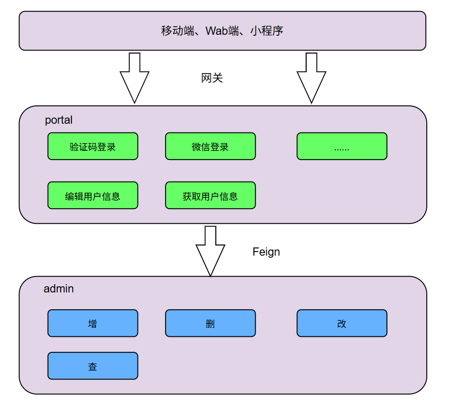 ● 可以得出,portal模块提供应用端需要的C端用户行为接口,具体能力的实现则依 admin模块 提供的服务(例如CRUD),不同模块之间的调用则可通过 Feign 接口完成。