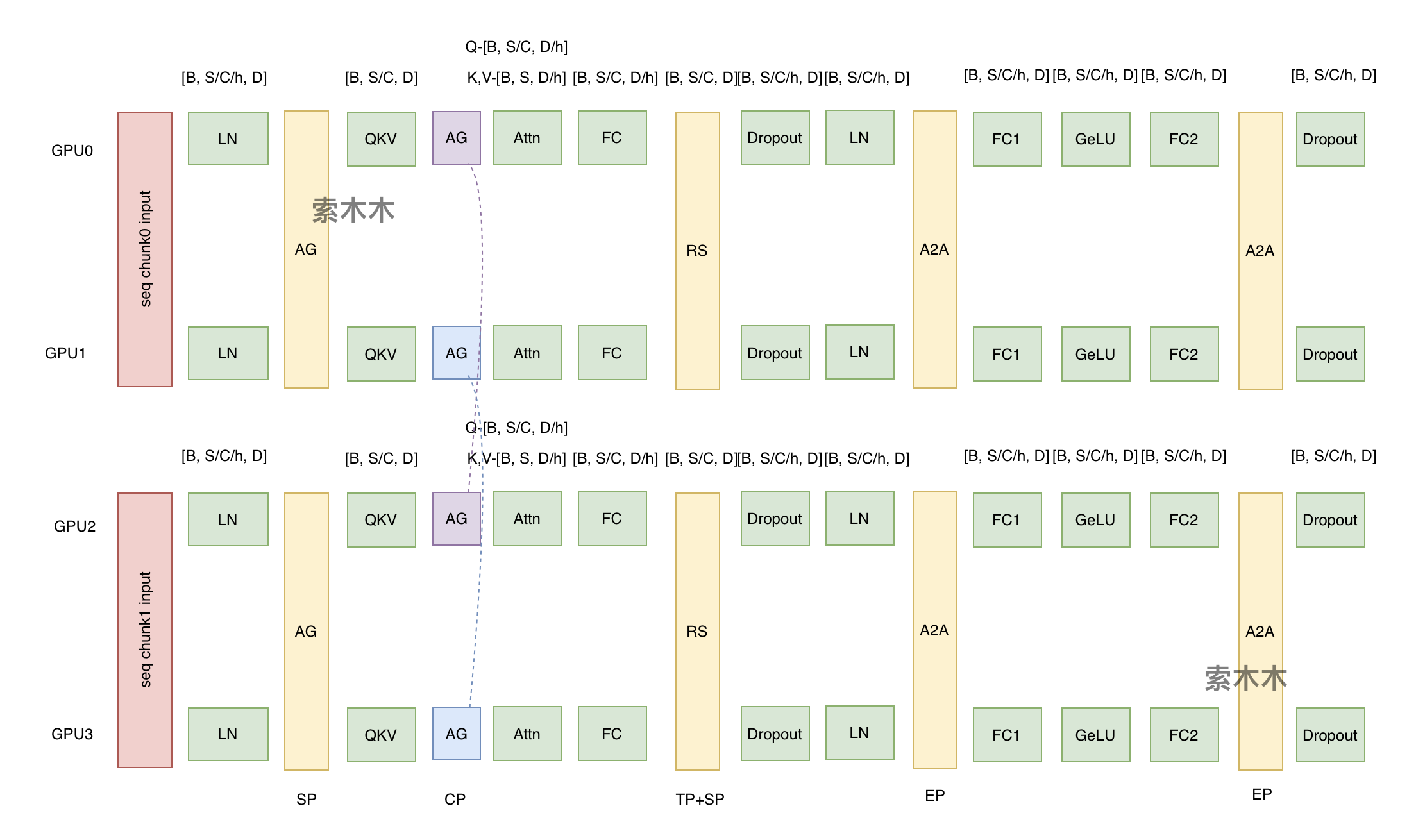 (2)全局K, V计算:K, V通过一次all-gather聚合,维度是[B, S, D/h]。