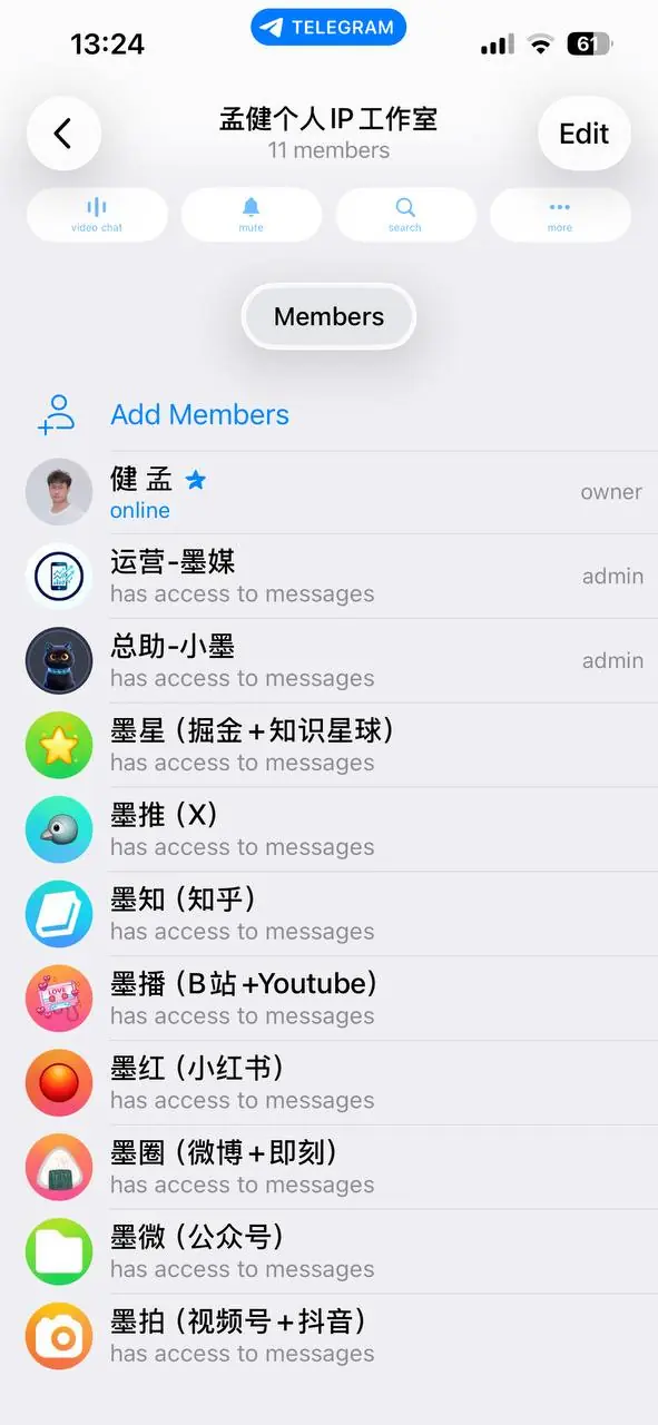 每个平台Agent都有自己的独立workspace和独立的Telegram bot。 它们在Telegram群里各自汇报,互不干扰。