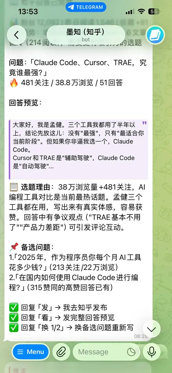 这一轮结束后,我的Telegram里会收到8条选题推送。我一般花3分钟扫一遍,回复几个"ok"或者"换一个"。