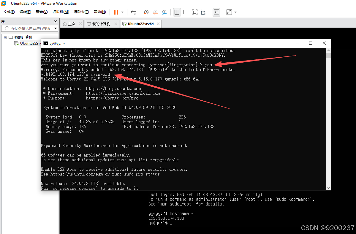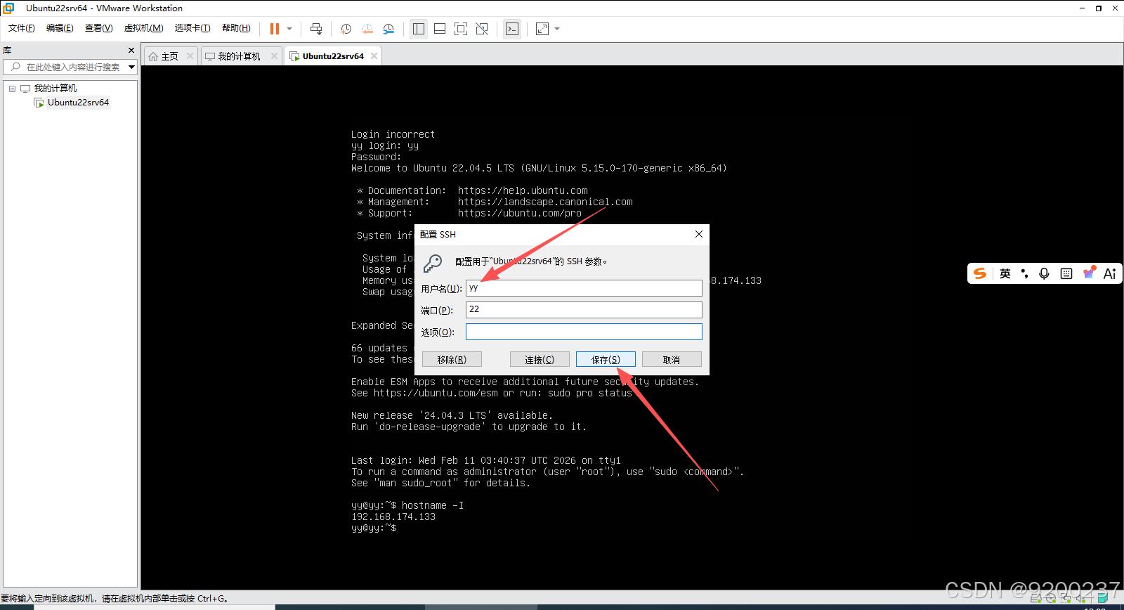 3、 我自己检查SSH配置,发现了问题,我配置的是root,但是root用户我在虚拟机里面测试是登录报错了,好像是密码不对。把SSH配置改成已经登录成功的yy,再尝试连接到SSH就可以了。