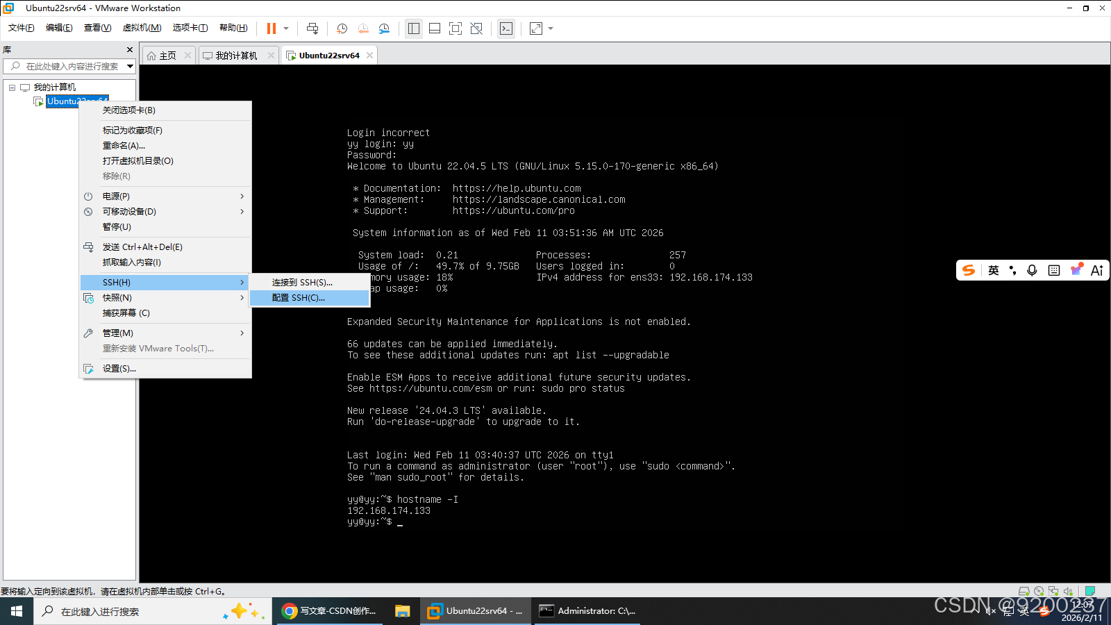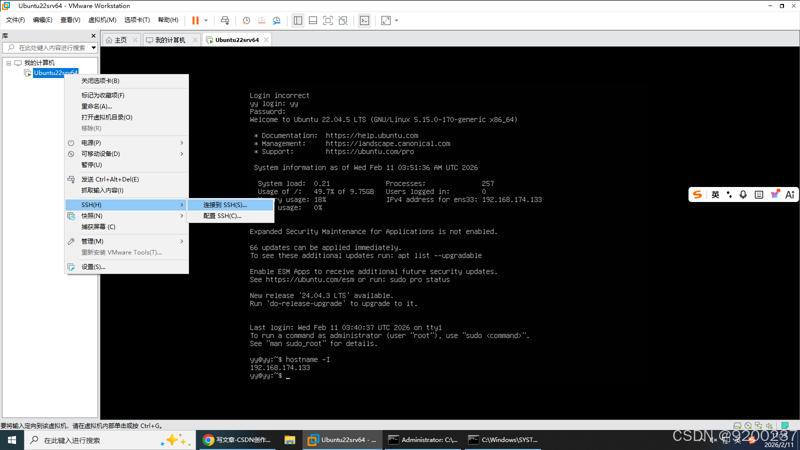1、如下图,我已经在虚拟机中登录了一个用户yy,然后在左侧对虚拟机点右键,用SSH连接。