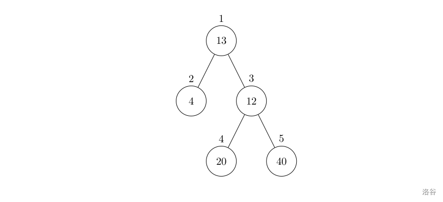 其中,圈中的数字表示结点中居民的人口。圈边上数字表示结点编号,现在要求在某个结点上建立一个医院,使所有居民所走的路程之和为最小,同时约定,相邻接点之间的距离为 1。如上图中,若医院建在 1 处,则距离和 =4+12+2×20+2×40=136;若医院建在 3 处,则距离和 =4×2+13+20+40=81。