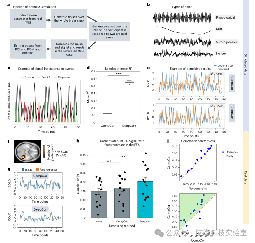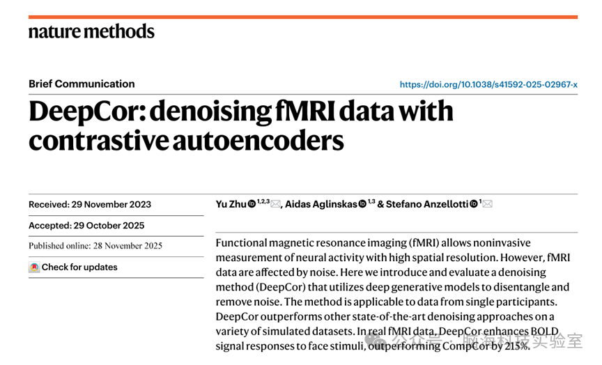 2025年11月28日,波士顿学院心理学与神经科学系的Yu Zhu、Aidas Aglinskas(共同第一作者)与Stefano Anzellotti(通讯作者)在 Nature Methods(IF=32.1)上发表了题为 "DeepCor: denoising fMRI data with contrastive autoencoders" 的文章。论文提出了一种基于生成式人工智能的fMRI 去噪框架 ------ DeepCor。该方法利用对比自编码器(contrastive autoencoder),从数据本身学习神经信号与非神经噪声之间的统计差异,从而实现更精准的信号重建。