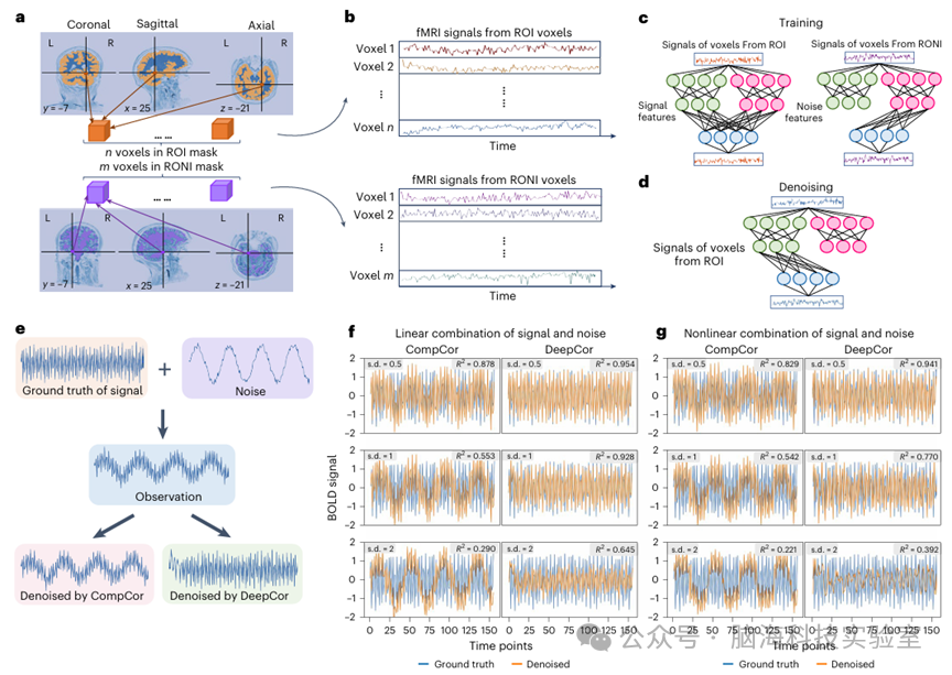 功能磁共振成像(fMRI)是研究人类脑功能的重要工具,但其数据长期受到噪声干扰的制约。比如,头部微动、呼吸与心跳等生理因素,以及扫描仪器本身的波动,都会影响 BOLD 信号的信噪比,从而影响脑功能定位、功能连接分析及结果的可重复性。尽管已有CompCor、ICA 等多种去噪方法被广泛使用,但这些方法大多依赖线性假设或人工规则,难以有效分离复杂、非线性的噪声成分。因此,亟需一种能够在保留真实神经信号的同时系统性去除噪声的新方法。