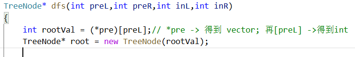 int rootVal = (*pre)[preL];// *pre -> 得到 vector; 再[preL] ->得到int