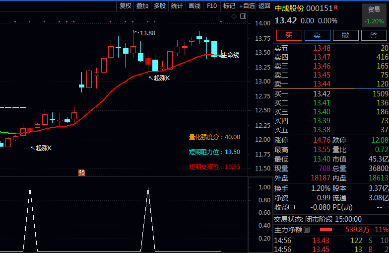 此外,指标界面顶部还会固定显示个股的概念、地域、行业及总市值等基础信息,并在右侧提供量化强度评分与短期阻力支撑位,辅助综合判断。