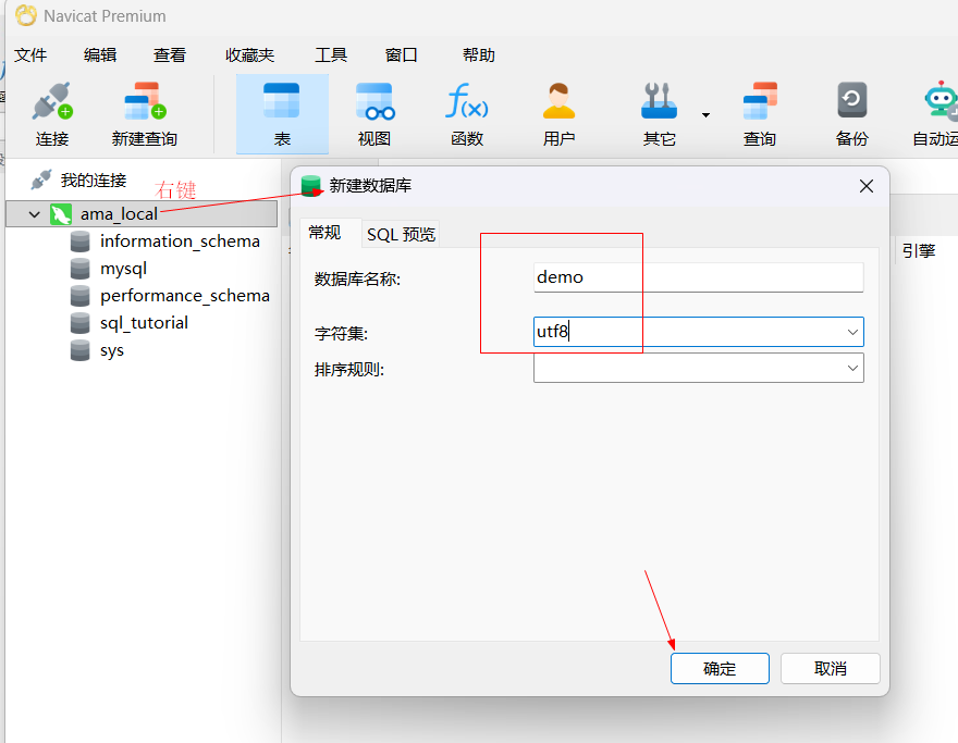 ama_local连接 → "新建数据库" - 输入数据库名: