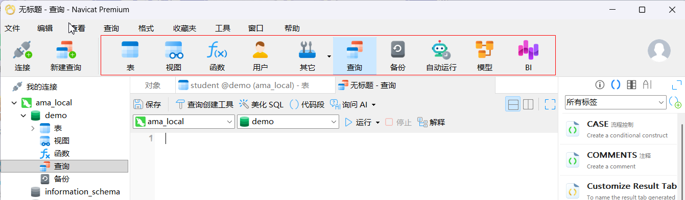 | 模型设计 | "模型"按钮 | 可视化设计 ER 图、表关系 |