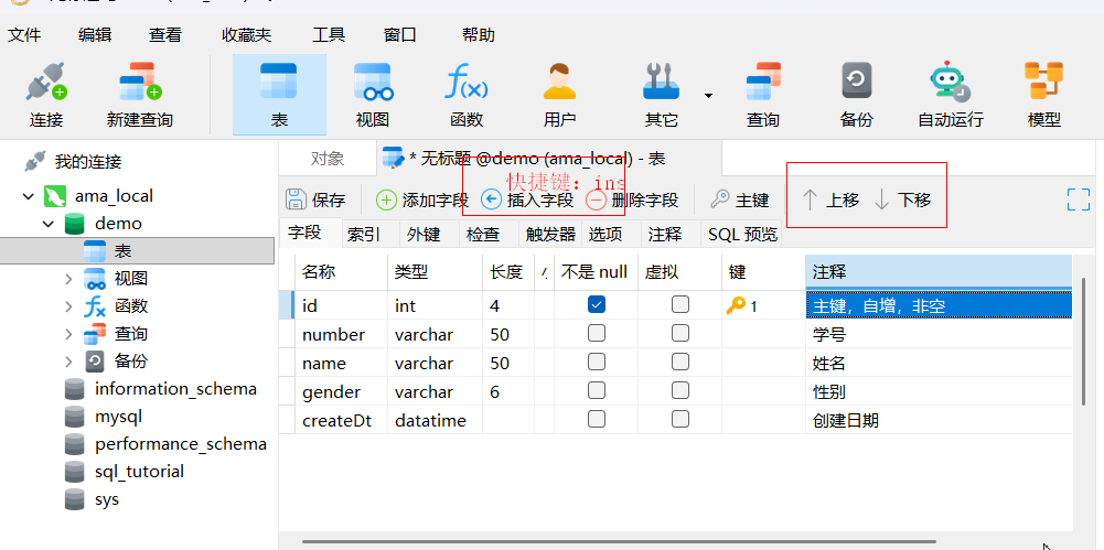 demo数据库 → 右键 "表" → "新建表" - 在"设计表"界面添加字段: