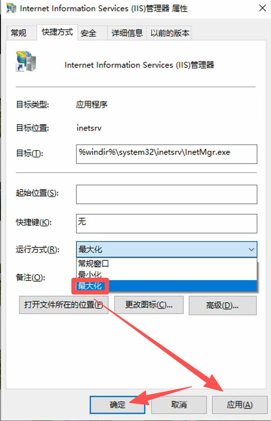 然后打开"快捷方式"页签,把"运行方式"修改为"最大化",然后点击"应用",然后"确定",然后重新启动 IIS , 就可以看到窗口了。