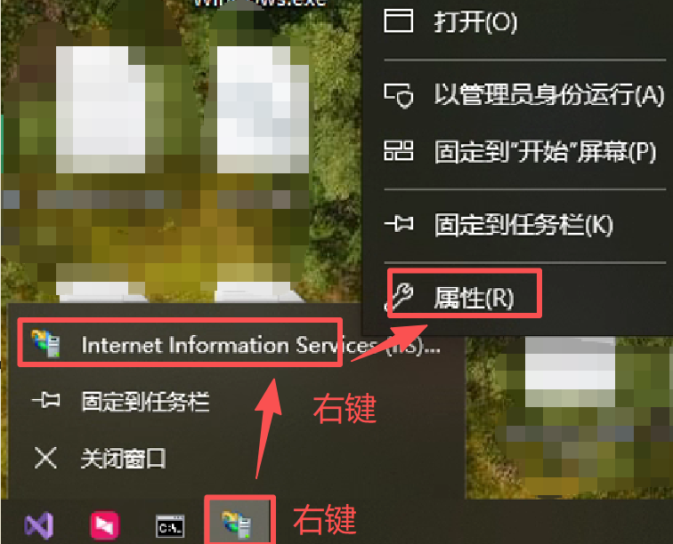 右键任务栏的iis图标,然后右键iis名称,点击"属性":