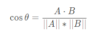 分子为A与B的点乘,分母为二者各自的L2相乘,即将所有维度值的平方相加后开方。