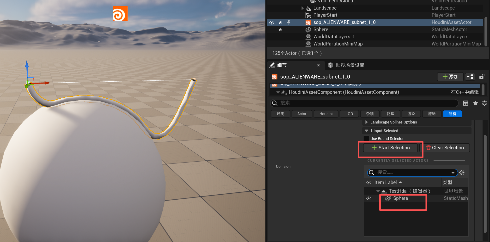我们在Collision下面选择需要碰撞的场景物体,这里选择的是一个sphere,选择成功后,开始模拟,就能与虚幻场景物体产生交互了!