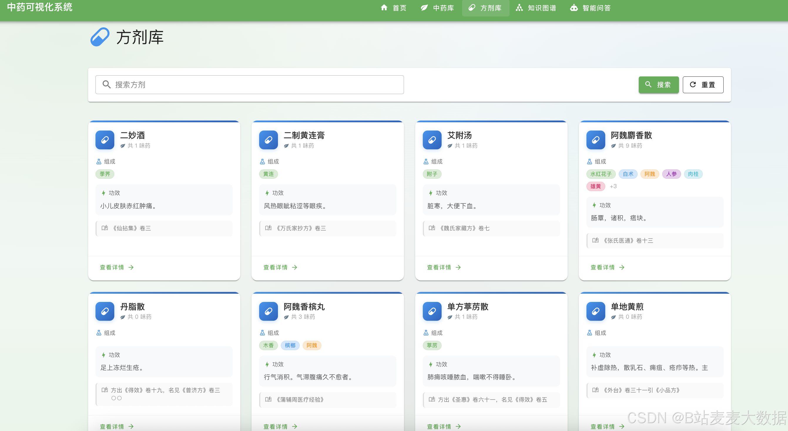 - 数据分散:中药、方剂、药性、归经等信息散落在不同数据源