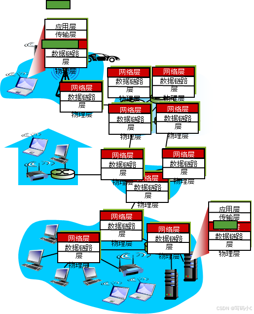 网络层的主要任务是实现端系统之间的多跳传输。数据在传输过程中,通常需要经过多个中间设备(路由器)的转发。
