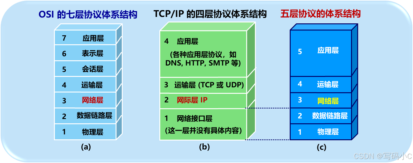 - 五层协议体系结构:为了便于分析,通常采用五层模型,网络层位于第 3 层。