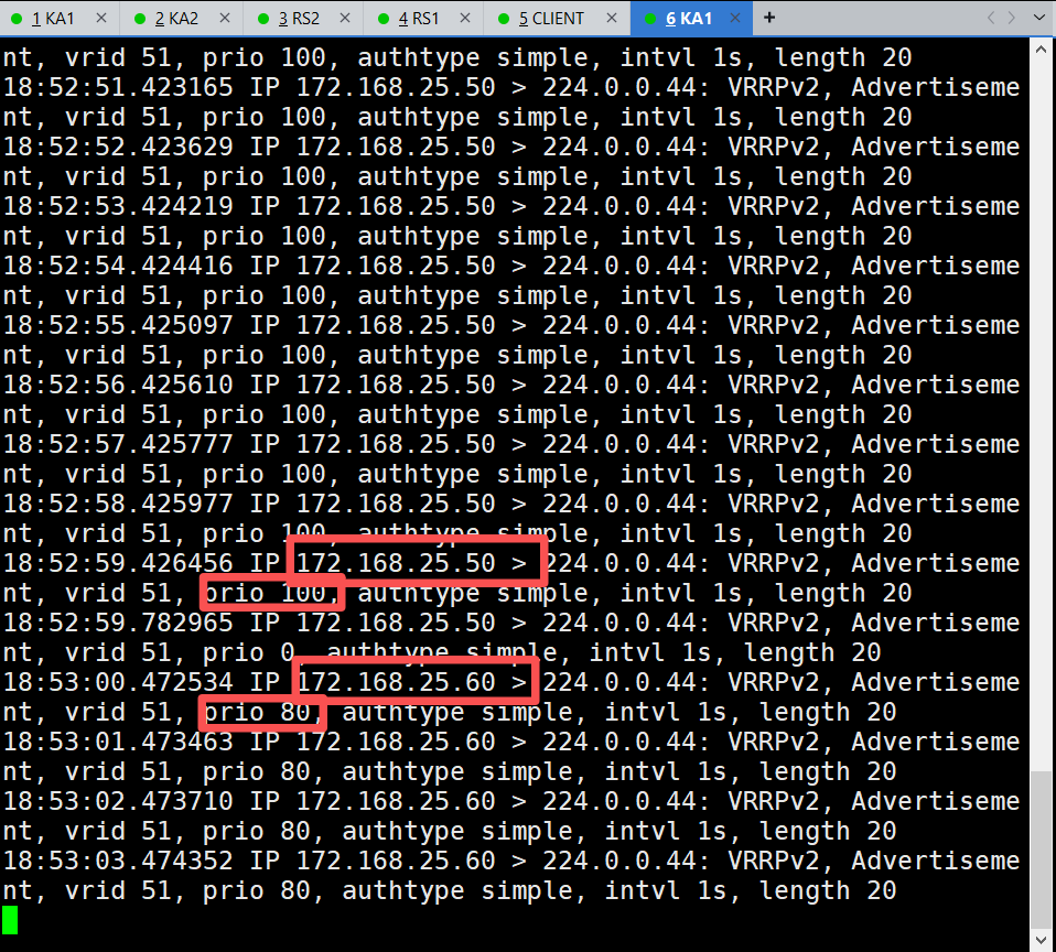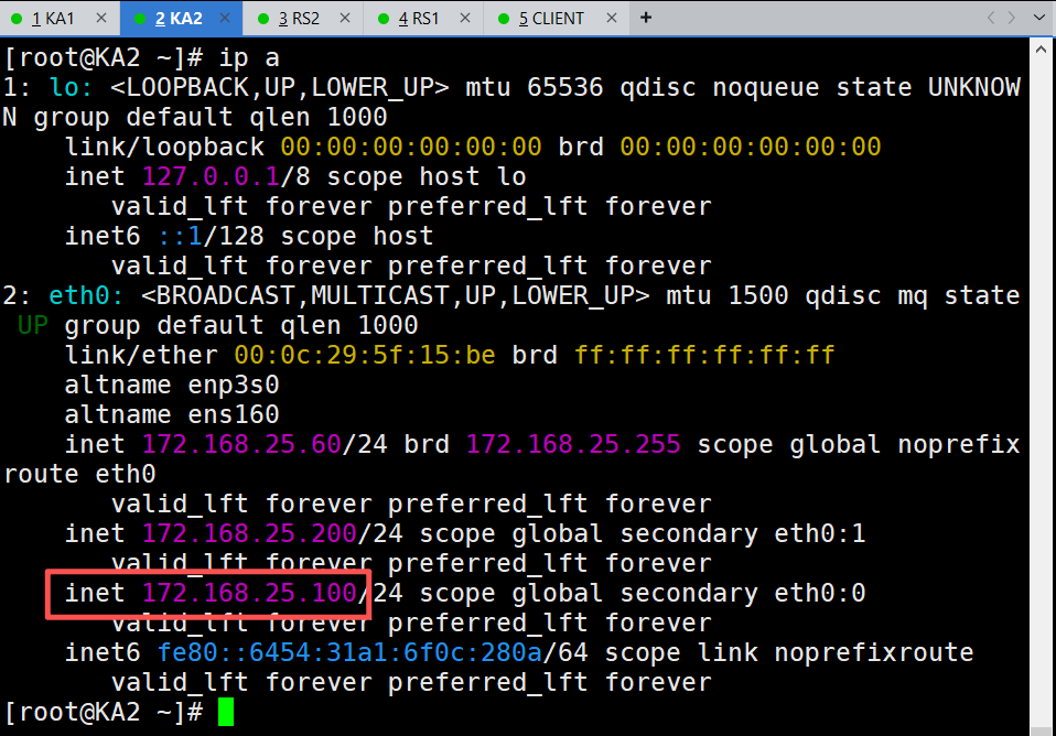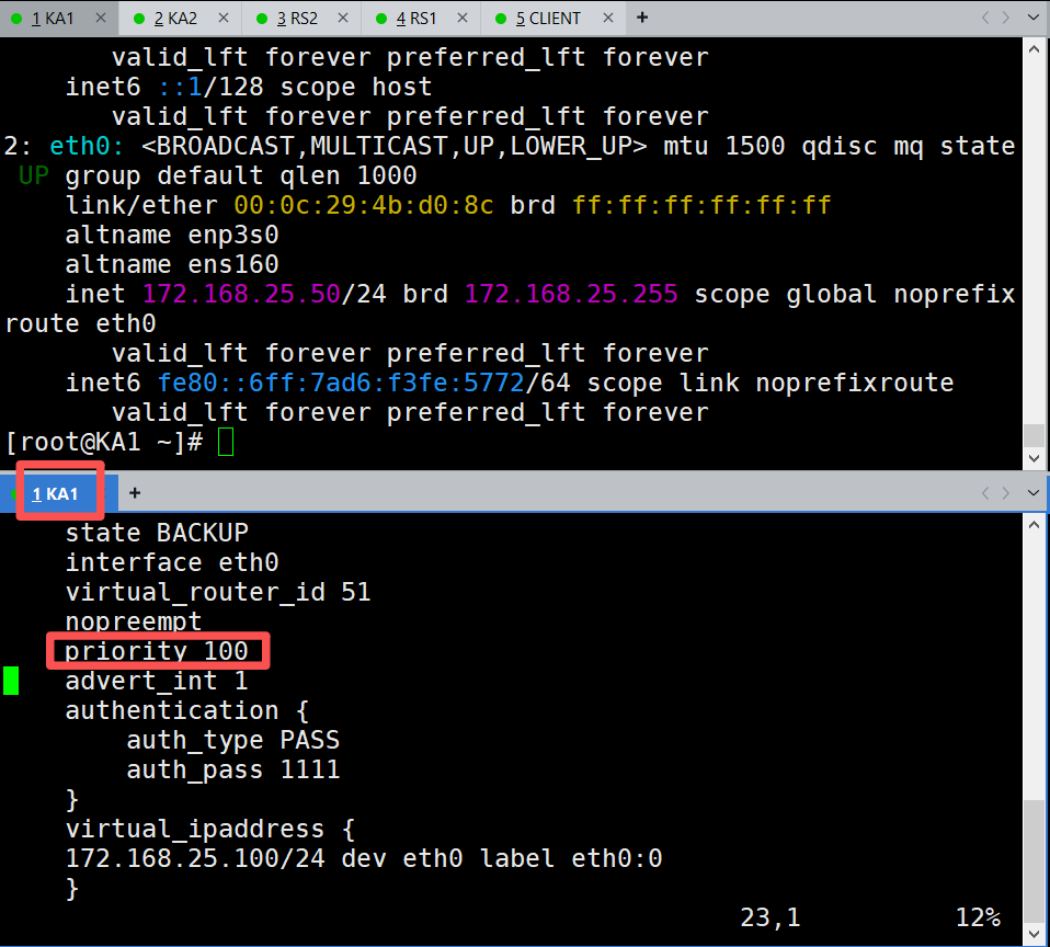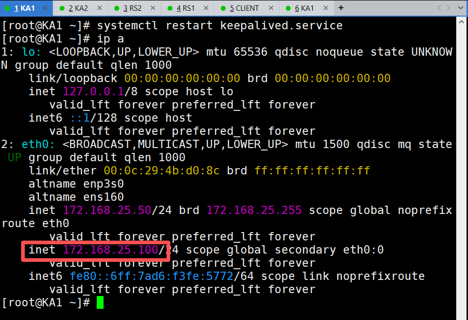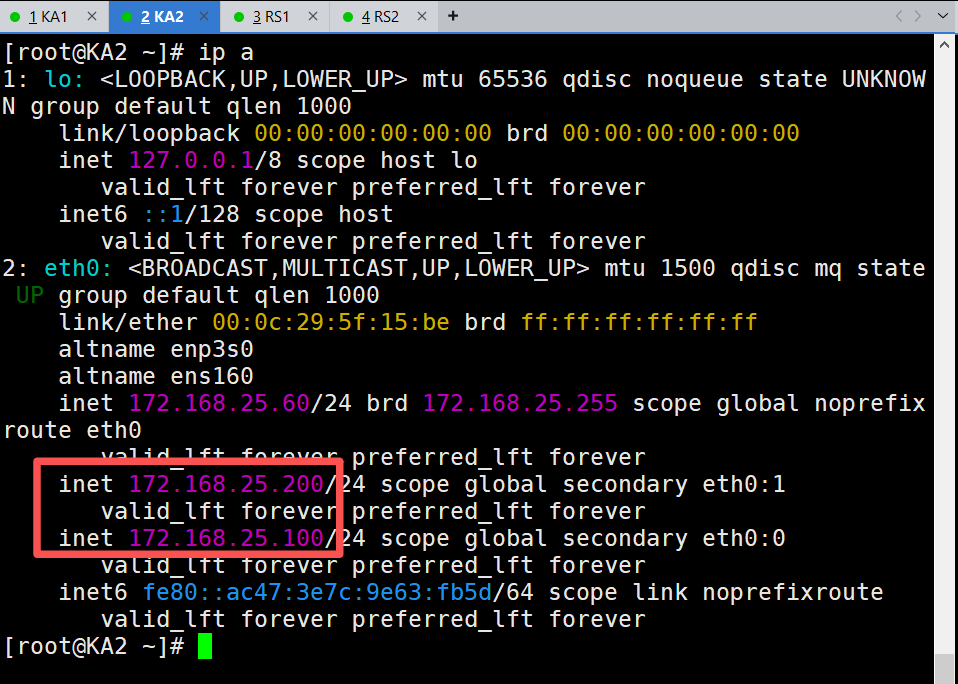 测试,首先停止KA2服务,再一同重启服务,通过watch -n 1 ip a 查看状态。发现十秒后KA1会抢占VIP。