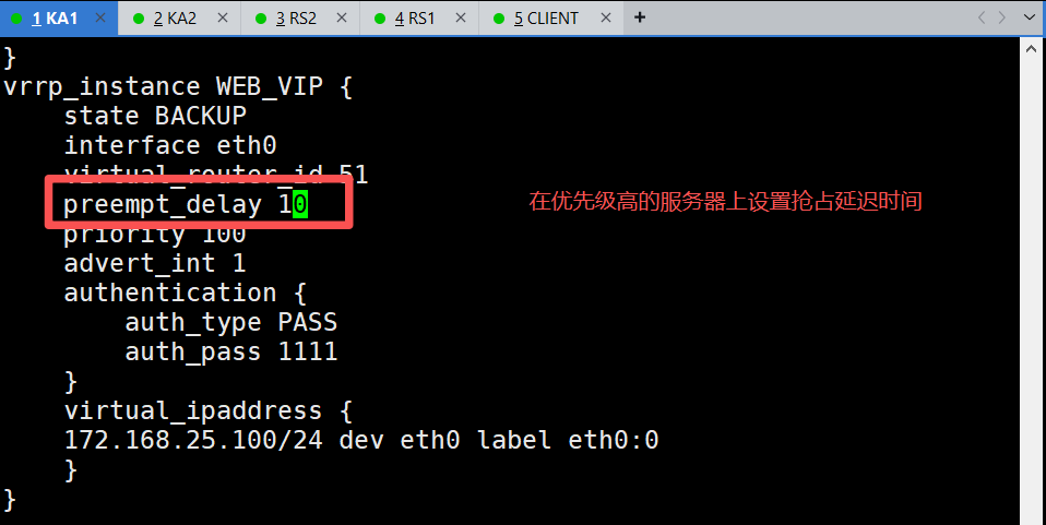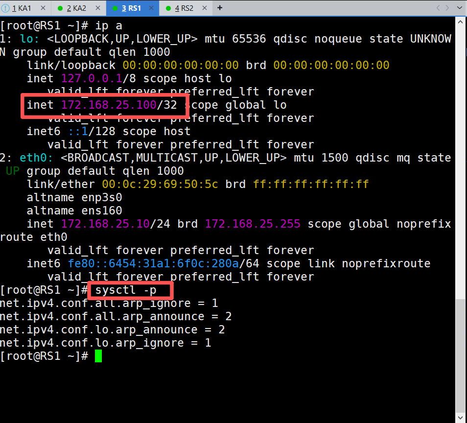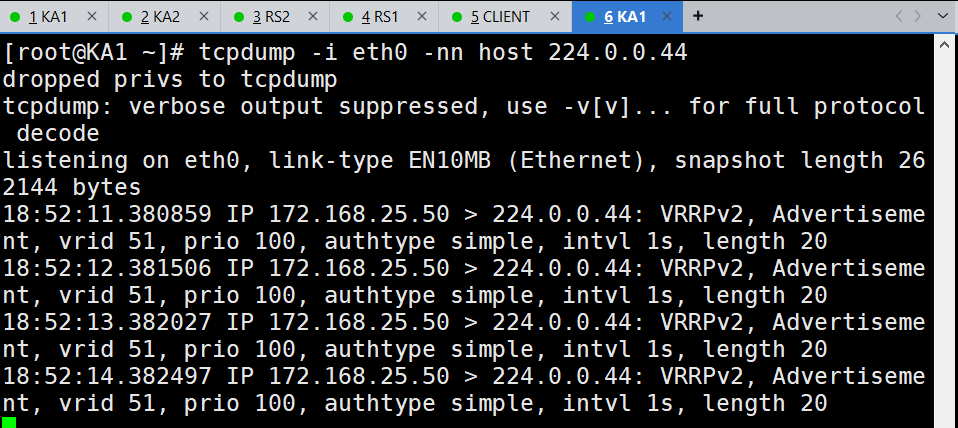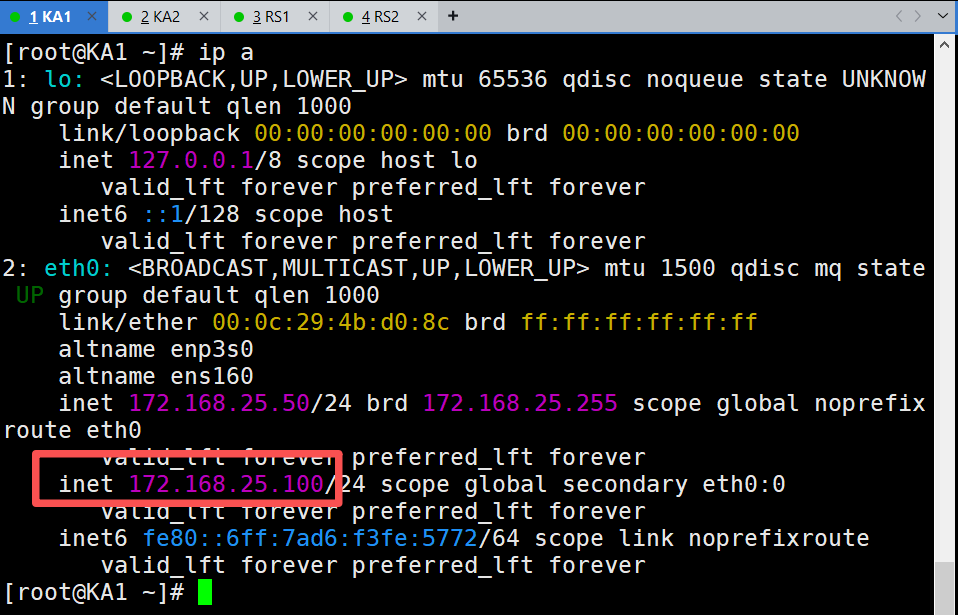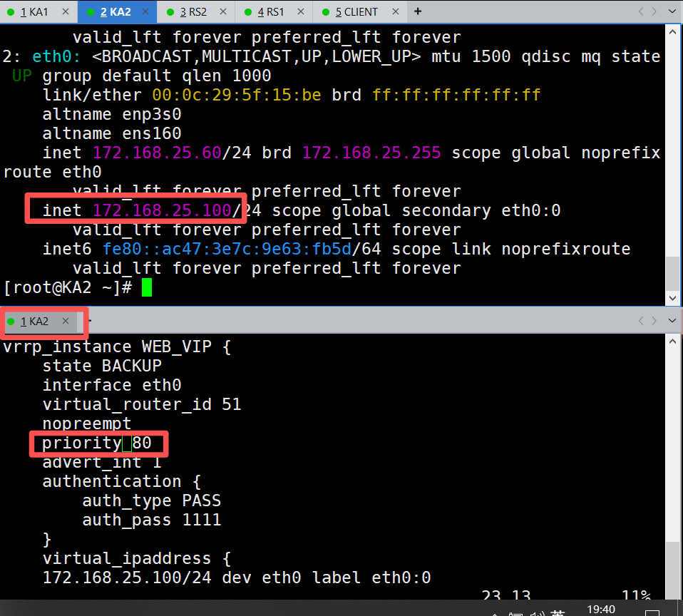 测试,首先停止KA2服务,再一同重启服务,通过watch -n 1 ip a 查看状态。发现十秒后KA1会抢占VIP。
