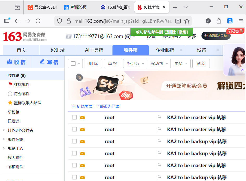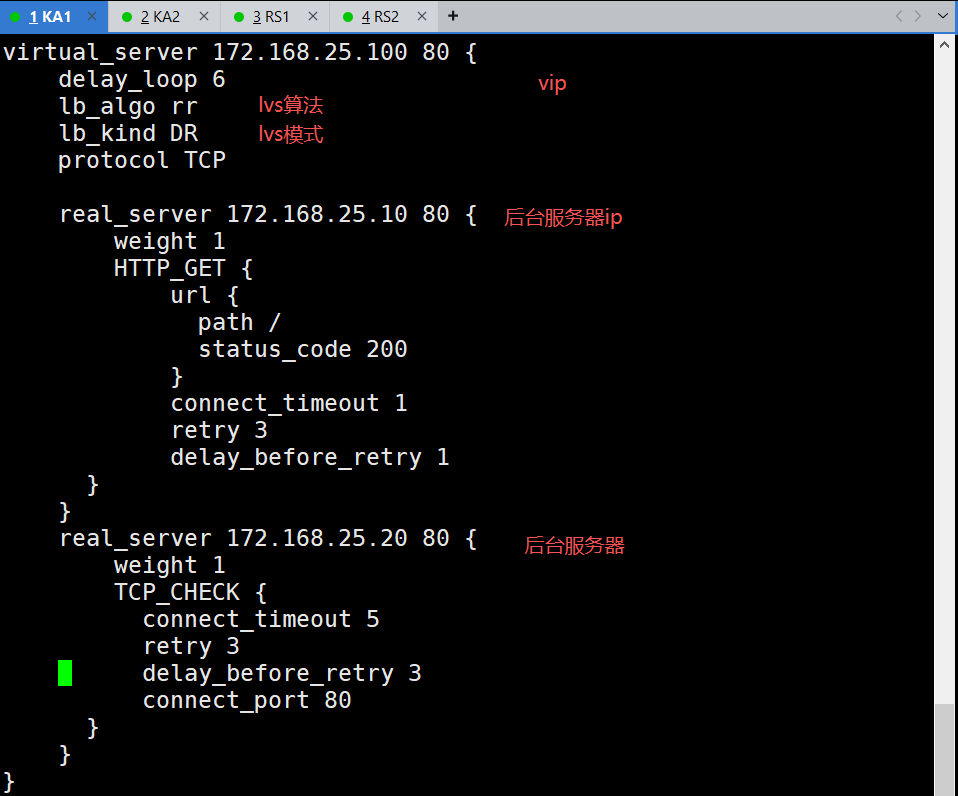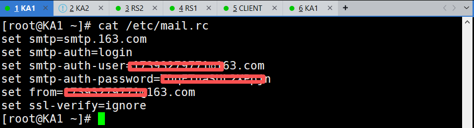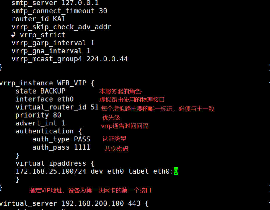 root@KA1 \~\]# dnf install s-nail postfix -y \[root@KA2 \~\]# dnf install s-nail postfix -y ### 2、邮件服务编辑配置文件 vim /etc/mail.rc  ### 3、设定邮件告警脚本 增加可执行权限 ```bash #!/bin/bash mail_dest='*********@163.com' mail_send() { mail_subj="$HOSTNAME to be $1 vip 转移" mail_mess="`date +%F\ %T`: vrrp 转移,$HOSTNAME 变为 $1" echo "$mail_mess" | mail -s "$mail_subj" $mail_dest } case $1 in master) mail_send master ;; backup) mail_send backup ;; fault) mail_send fault ;; *) exit 1 ;; esac ``` ### 4、配置keepalived告警  ### 5、vip迁移邮件告警测试  ## 七、keepalived的双主模式 双主模式即为互为备份有两个VIP。 ### 1、编写配置文件,设置两个vip两台服务器互为备份  名称与优先级不同,其余均一致,相互为备份。 ### 2、重启后测试效果   停止KA1keepalived查看vip变化  ## 八、实现LVS的高可用性 ### 1、RS服务器配置 设置同keepalived的vip环回地址,并设置vrp禁ping。  ### 2、配置keepalived主机 编写配置文件  2、测试 通过动态查看watch -n 1 ipvsadm -Ln 停止KA1服务。  停止后规则会自动转到KA2中。 ## 九、双主模式代理不同业务 两个VIP分别代理web业务与mysql数据库业务 在上述实验中已经将web业务服务叙述完毕,现将两种业务用不同的子配置文件进行编写。 首先在业务主机中增加数据库服务的VIP ### 1、在业务主机中下载数据库服务,并建立用户并给其权限。 dnf install mariadb-server -y ### 2、修改主配置文件后,编写子配置文件 1)web服务  2)数据库服务  ### 3、测试通过VIP分别访问数据库服务和web服务  ## 十、利用VRRP Script实现全能的高可用性 1、主旨就是备份调度器通过keepalived使用VRRP协议发送信息监控其是否存活,若不发送信息则讲VIP迁移至另外一台调度器。 2、haproxy的高可用是keepalived通过脚本测试haproxy是否是在正常工作,若正常工作则它的优先级不改变,若非正常工作通过keepalived的降低优先级的配置,将VIP让出去。 ### 1、在Keepalived业务主机中安装Haproxy并业务主机开启内核路由功能 > \[root@KA1+2 \~\]# dnf install haproxy-2.4.22-4.el9.x86_64 -y > > \[root@KA1 \~\]# vim /etc/sysctl.conf > > \[root@KA1+2 \~\]# vim /etc/sysctl.conf > > net.ipv4.ip_nonlocal_bind=1 ### 2、编写Haproxy配置文件增加调度规则 > vim /etc/haproxy/haproxy.cfg > > listen webserver > > bind 172.25.254.100:80 > > mode http > > server web1 172.25.254.10:80 check > > server web2 172.25.254.20:80 check > > > \[root@KA1+2 \~\]# systemctl enable --now haproxy.service ### 3、Keepalived与Haproxy联动 1、编写Haproxy测试脚本 只需要在优先级高的主服务器上配置即可 > \[root@KA1 \~\]# vim /etc/keepalived/scripts/haproxy_check.sh > > #!/bin/bash > > killall -0 haproxy \&\> /dev/null > > \[root@KA1 \~\]# chmod +x /etc/keepalived/scripts/haproxy_check.sh 2、编写在keepalived中Haproxy测试板块  ### 4、通过Haproxy状态运行测试 Haproxy停止运行后VIP自动跳转到KA2上