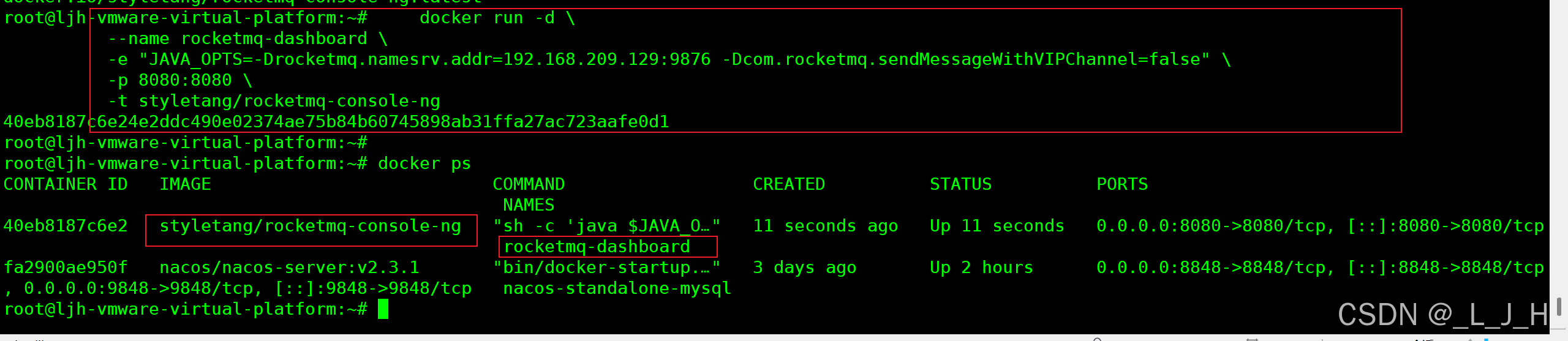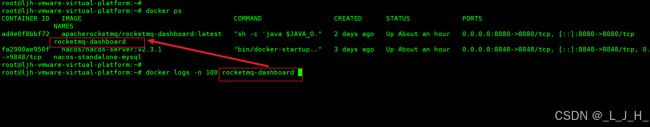 2-1:通过 docker 容器名字查看日志 docker logs -f rocketmq-dashboard