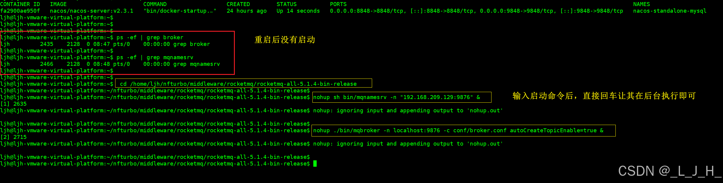 虚拟机重启之后,目前broker 和 nameserver 还不会自动启动,手动命令启动