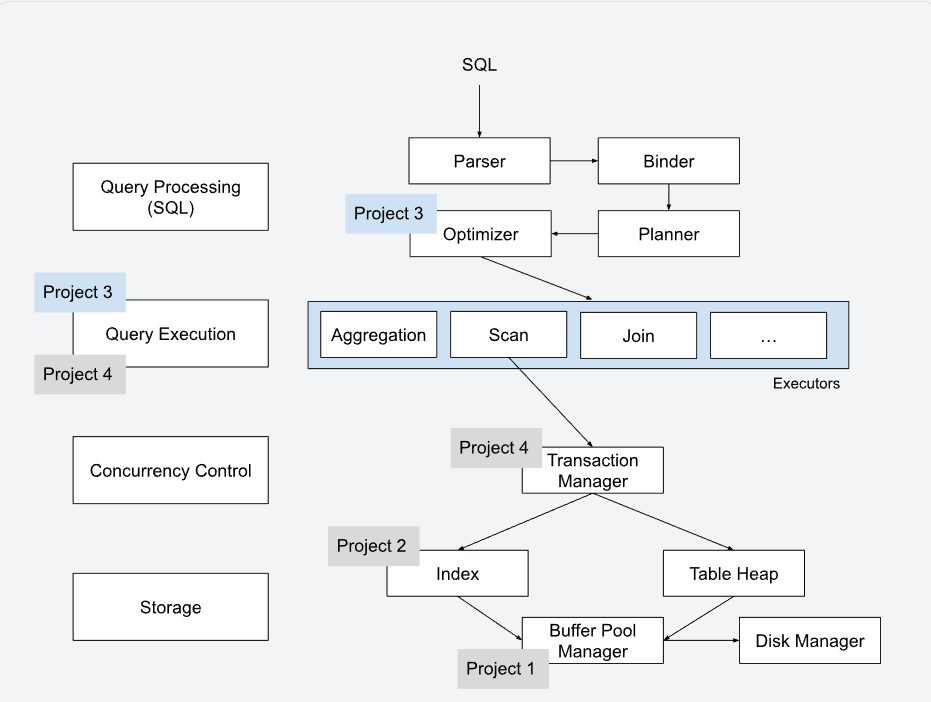 Optimizer(优化器) :这是 Project 3 的一部分。它通过启发式规则或代价模型,将逻辑计划转换为最优的物理查询计划。
