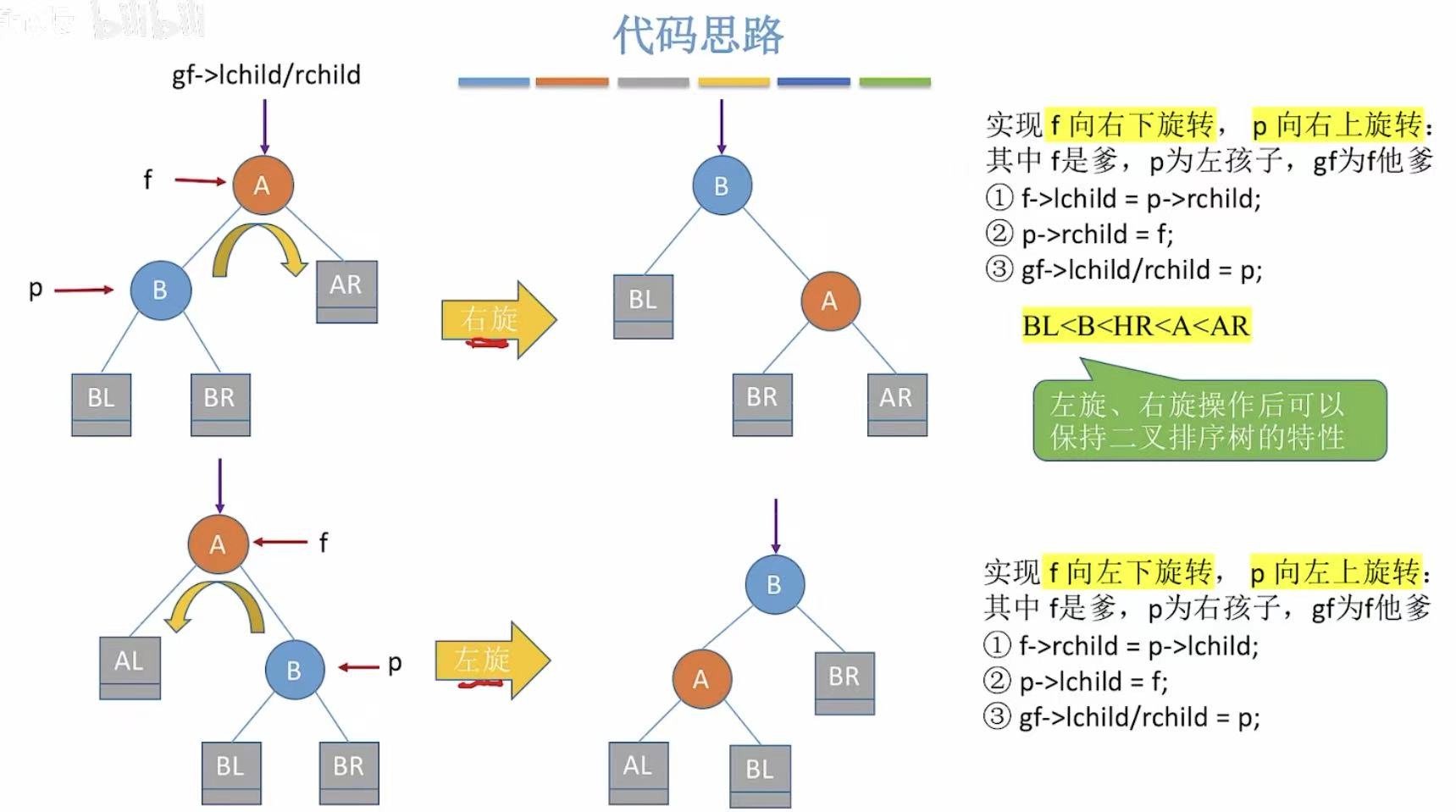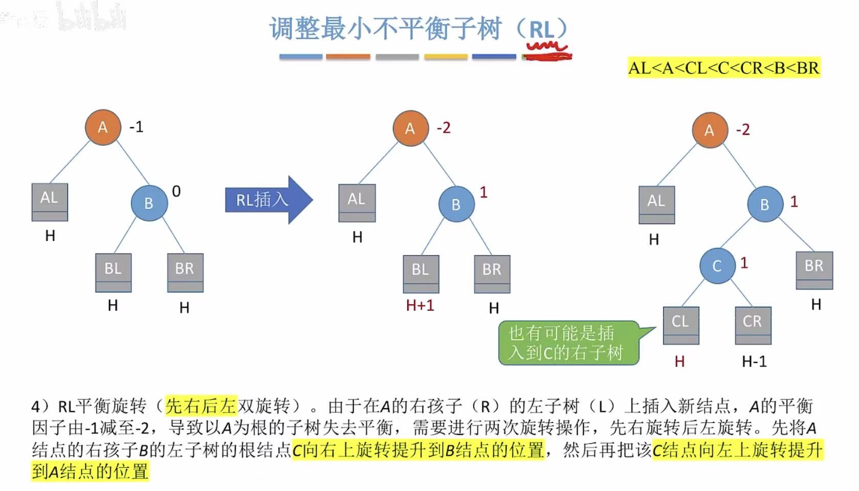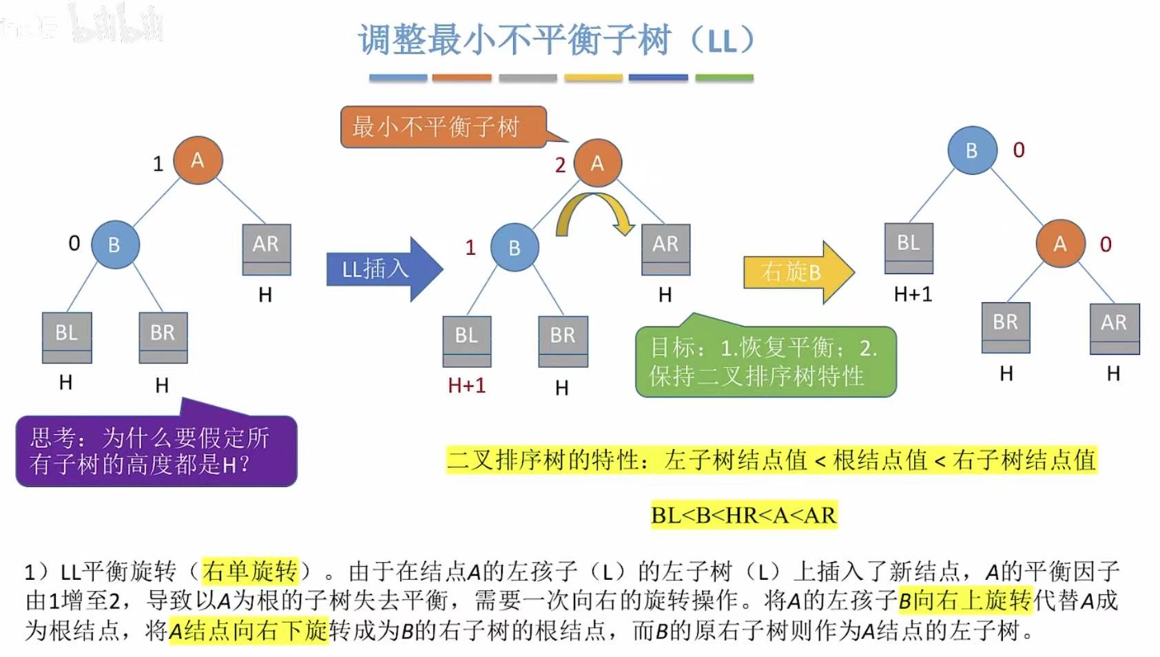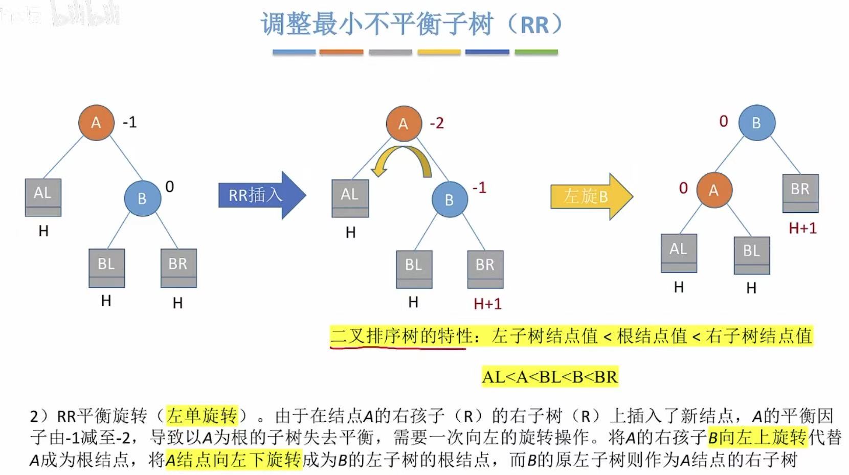 - 左单旋转:B上A下,因为A下来变成了B结点的右孩子,BL就多出来了,就让给A带。