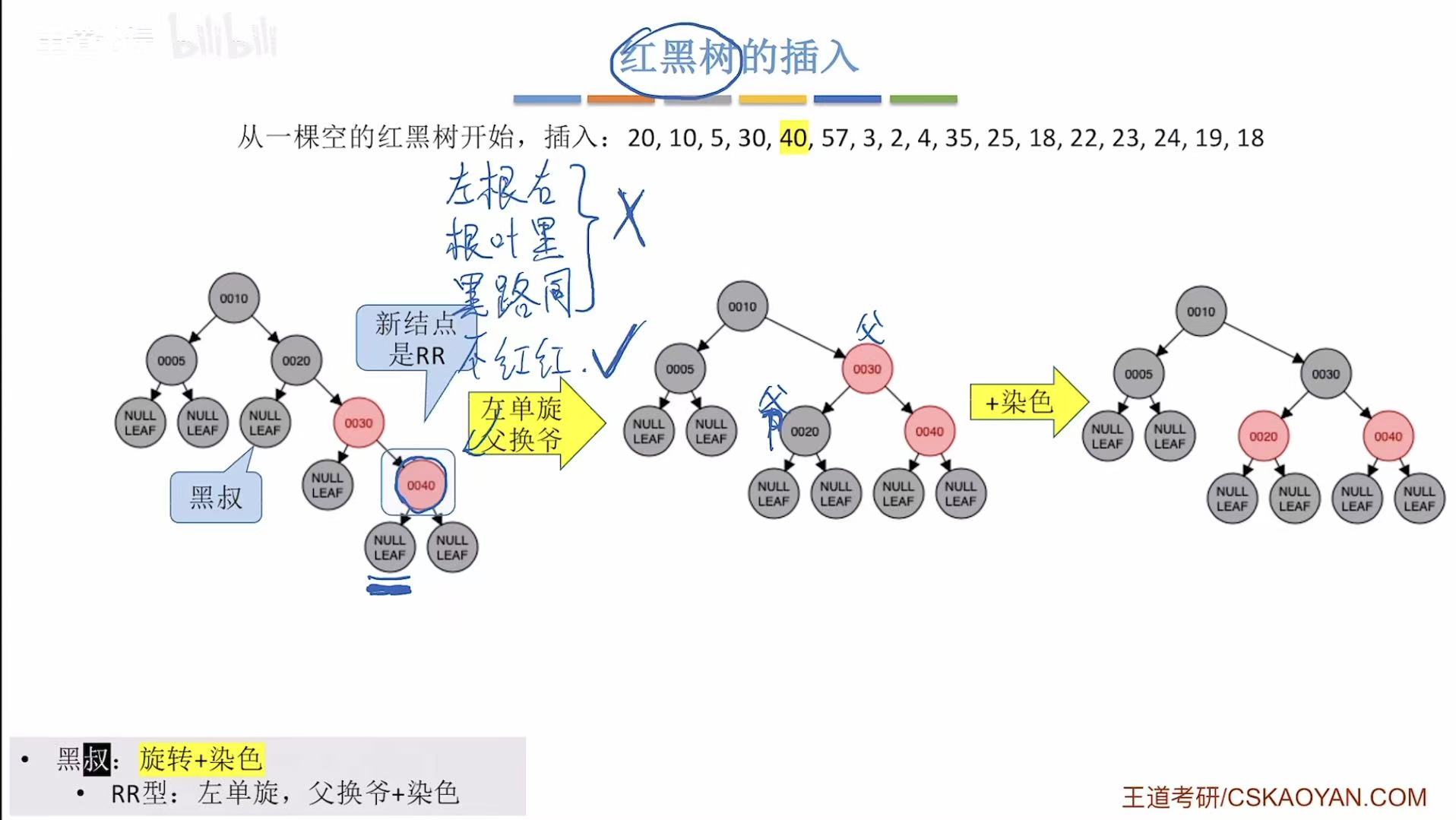 - 添加40:非根,为红色-->违反不红红-->黑叔-->RR型-->旋转+染色