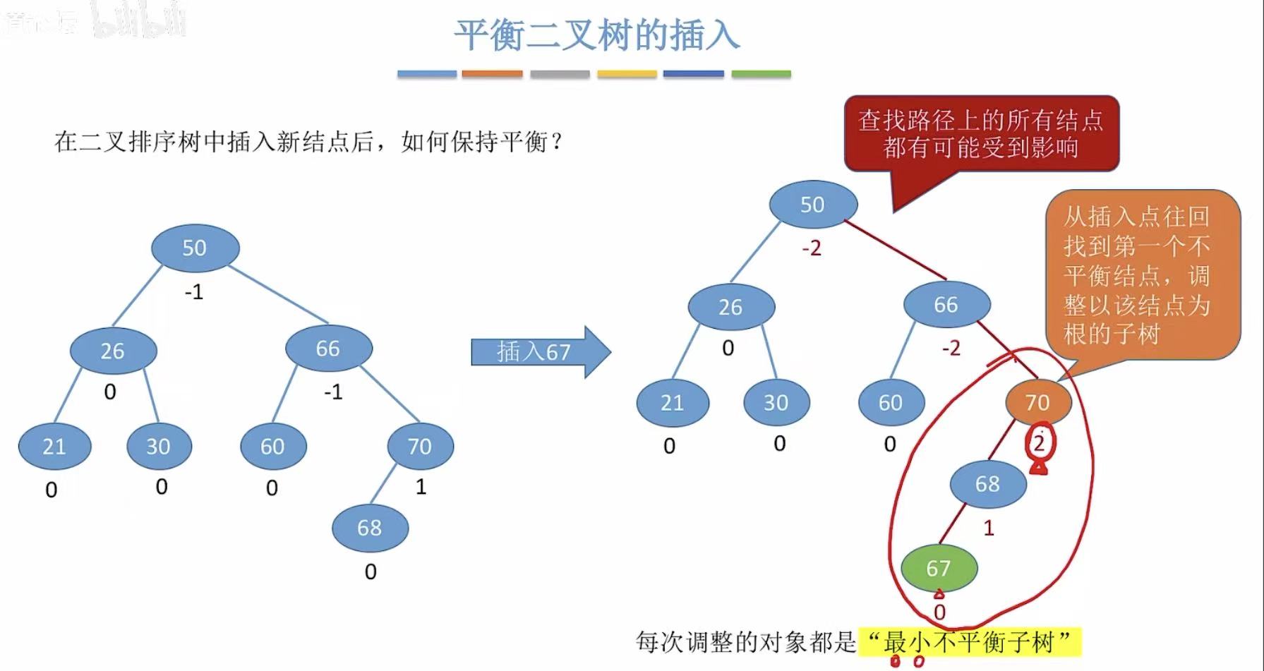 比如:右图中我们插入67 导致二叉树不平衡,我们就算出每个结点的平衡因子,当平衡因子为-2 的时候,就代表这个结点不平衡 ,也就是从70 开始向上的结点都不平衡,我们就要调整以70为根的子树 ,这个子树就是最小不平衡树 。