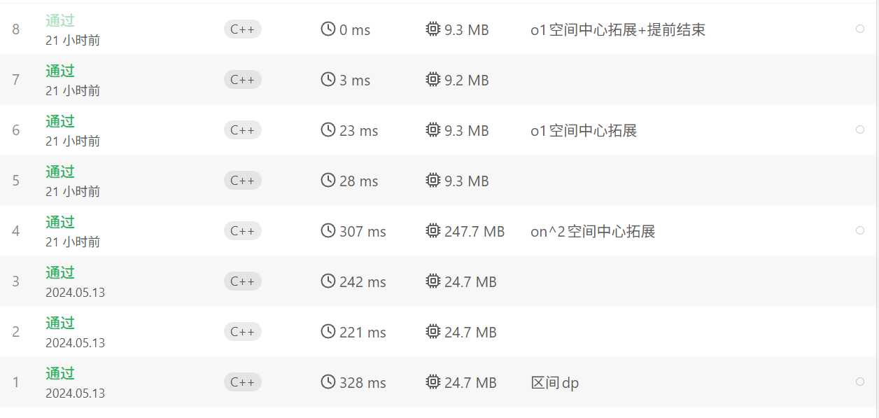 所以更好的写法是,在中心拓展的过程中,每次拓展一步,意味着找到一个回文,就转移一次,这样空间 O ( 1 ) O(1) O(1)了,一般来讲这种 O ( 1 ) O(1) O(1)空间相比于 O ( n 2 ) O(n^2) O(n2)空间,即使时间复杂度相同,常数也会差十倍左右,这就是访存开销带来的,所以优化内存访问也是很重要的一环。