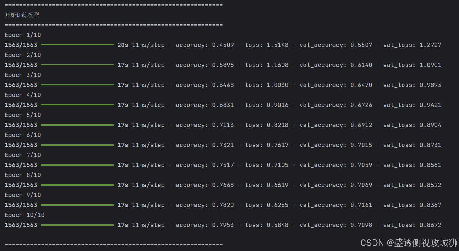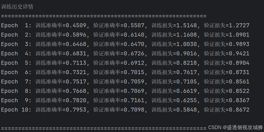- 训练模型部分则完整展示了从编译模型(配置优化器、损失函数与评估指标)、启动训练到实时监控训练过程(如损失与准确率曲线)的完整流程。