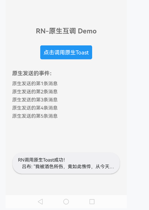 ToastModule.showToast("RN调用原生Toast成功! \n 吕布: \"我被酒色所伤,竟如此憔悴,从今天开始戒酒!\"", 1); // 1=Toast.LENGTH_LONG