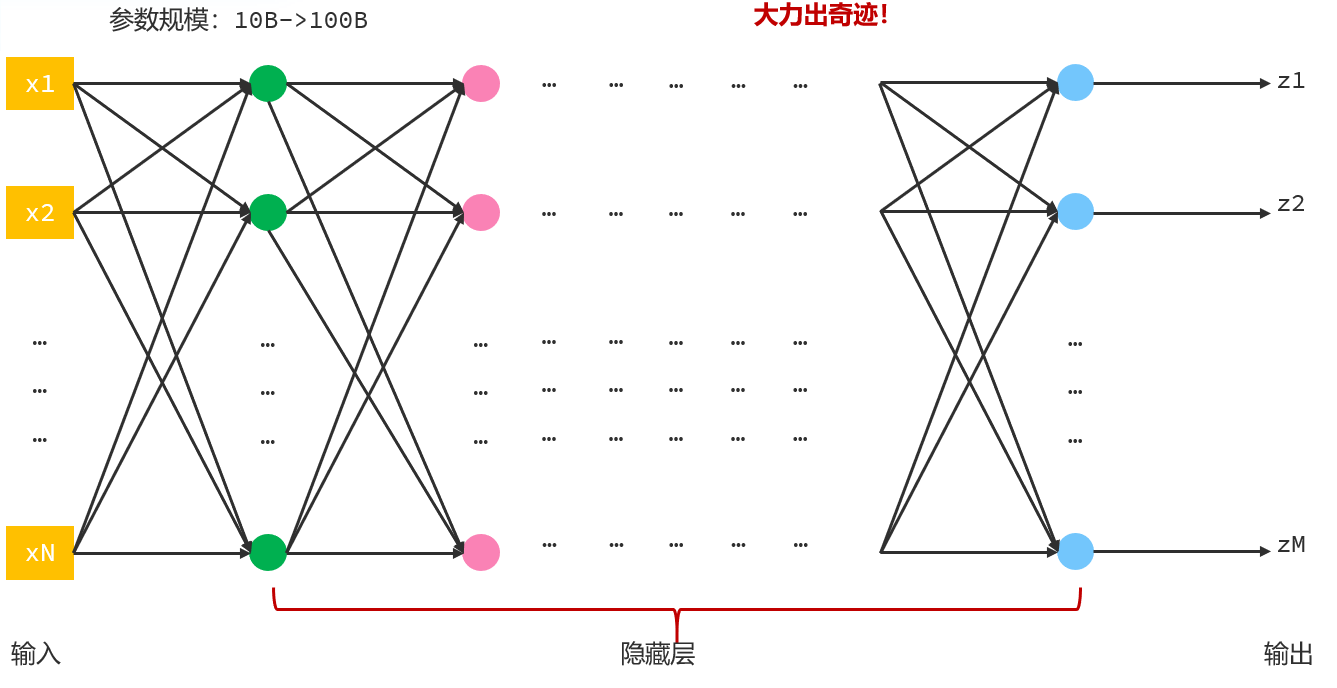 它们公司有一个比较出名的模型叫做GPT,原本这家公司并不出名,它能发展到现在,被广为人知,源于一个偶然的事件。GPT模型在处理一些任务的时候,表现的并没有那么好,它们的研发人员就想,实在不行,多加一些神经元试试。于是,它们就将参数的规模从原来的10B提高到100B,1B是10亿,所谓的100B就是1000亿,这一下不得了了,GPT模型不仅能够很完美的处理之前处理不好的任务,而且它展现出了通用任务的处理能力,这种现象连研究人员都无法很透彻的解释,简单点儿说,就是大力出奇迹!