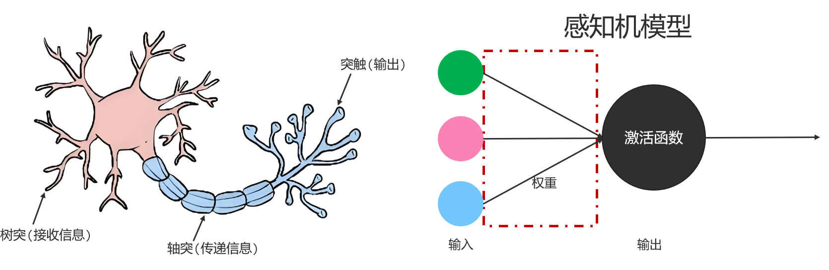 如果我们想通过模拟人脑的方式实现人工智能,我们得先模拟出一个神经元。于是一个叫罗森布拉特的人提出了著名的感知机模型,用于模拟神经元。在感知机模型中,输入类比神经元的树突、权重类比神经元的连接强度、激活函数类比神经元的突触。假设输入和激活函数都不变的情况下,我们可以通过调整权重值,得到不同的输出。