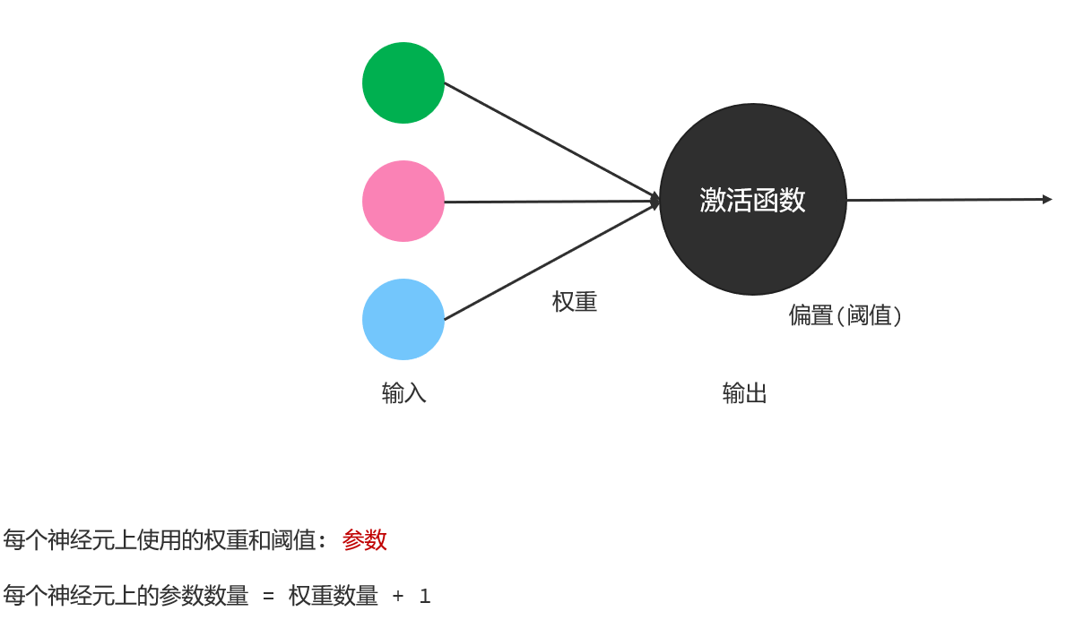 回到咱们刚才介绍的感知机模型中,我们说单个感知机模型是用于模拟单个神经元的,每个感知机上都有输入、权重、和激活函数,将来结合用户的输入和权重以及激活函数,再与阈值比较,得到最终的输出,这里的阈值有一个更专业的叫法是偏置。每个神经元上使用的权重和阈值,我们都把它称为参数。每个神经元上的参数数量=权重数量+1,这里的1就是偏置。