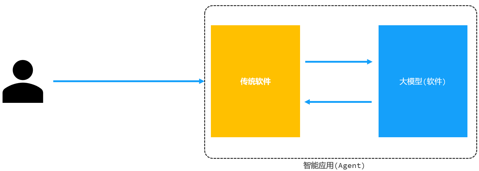 接下来给大家解释一下什么是智能应用。大模型就是实现了一些数学模型的软件,但是有个问题,这种软件普通人是无法直接使用的,比如我爷爷奶奶、儿子女儿,他们完全不懂代码,他们是无法直接使用大模型的。作为普通人来讲,使用的软件依然是传统的软件, 滴滴、淘宝、office等等这样的pc端软件或者移动端软件。如果我们要对传统的软件做智能化升级改造, 我们就需要将大模型接入到传统的软件中,借助于大模型的能力,让软件的功能变得更强大、更智能,这就是所谓的智能应用。也有另外一种主流的叫法:Agent,这一赛道的人才需求正快速增长,因为所有行业都需要 "AI 化改造",是当前 AI 就业的核心方向。