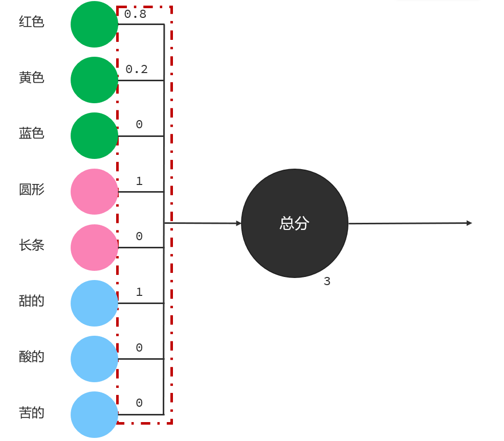 当然刚才我们识别的是香蕉,如果要识别苹果可不可以呢?也是可以的,我们只需要调整不同特征对应的权重值就可以了,比如把红色的权重设置为0.8、黄色的权重设置为0.2、圆形的权重设置为1、甜的权重设置为1,这样就可以识别苹果了。