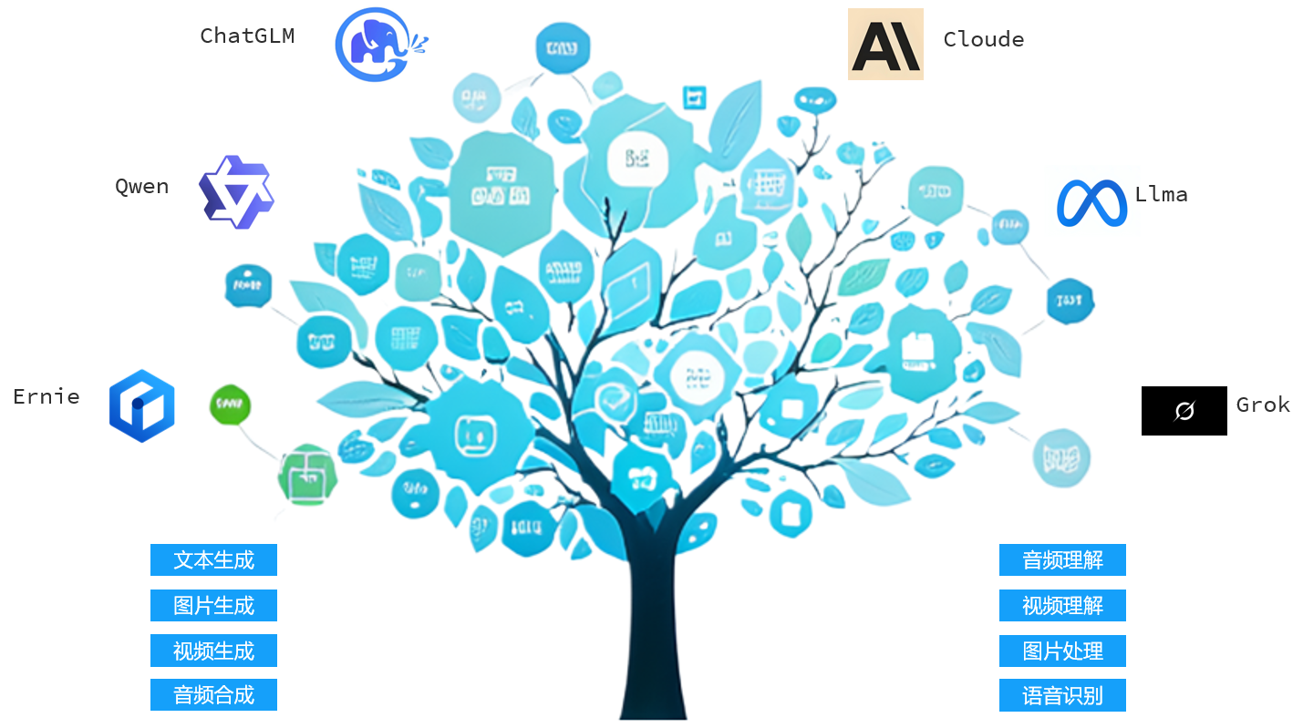 随着GPT模型的爆火,全球各大公司也纷纷跟进,推出了自己的大模型,比如智普AI的ChatGLM,阿里的Qwen,百度的Ernie,Anthropic公司的Cloude,元宇宙的Llma,马斯克的Grok等等等等,数不胜数,不同公司的不同模型,也有不同的擅长领域,比如文本生成、图片生成、视频生成、音频合成、音频理解、视频理解、图片处理、语音识别等等,目前整个AI领域,处于一种快速发展的状态,也就是咱们老话常说的风口。