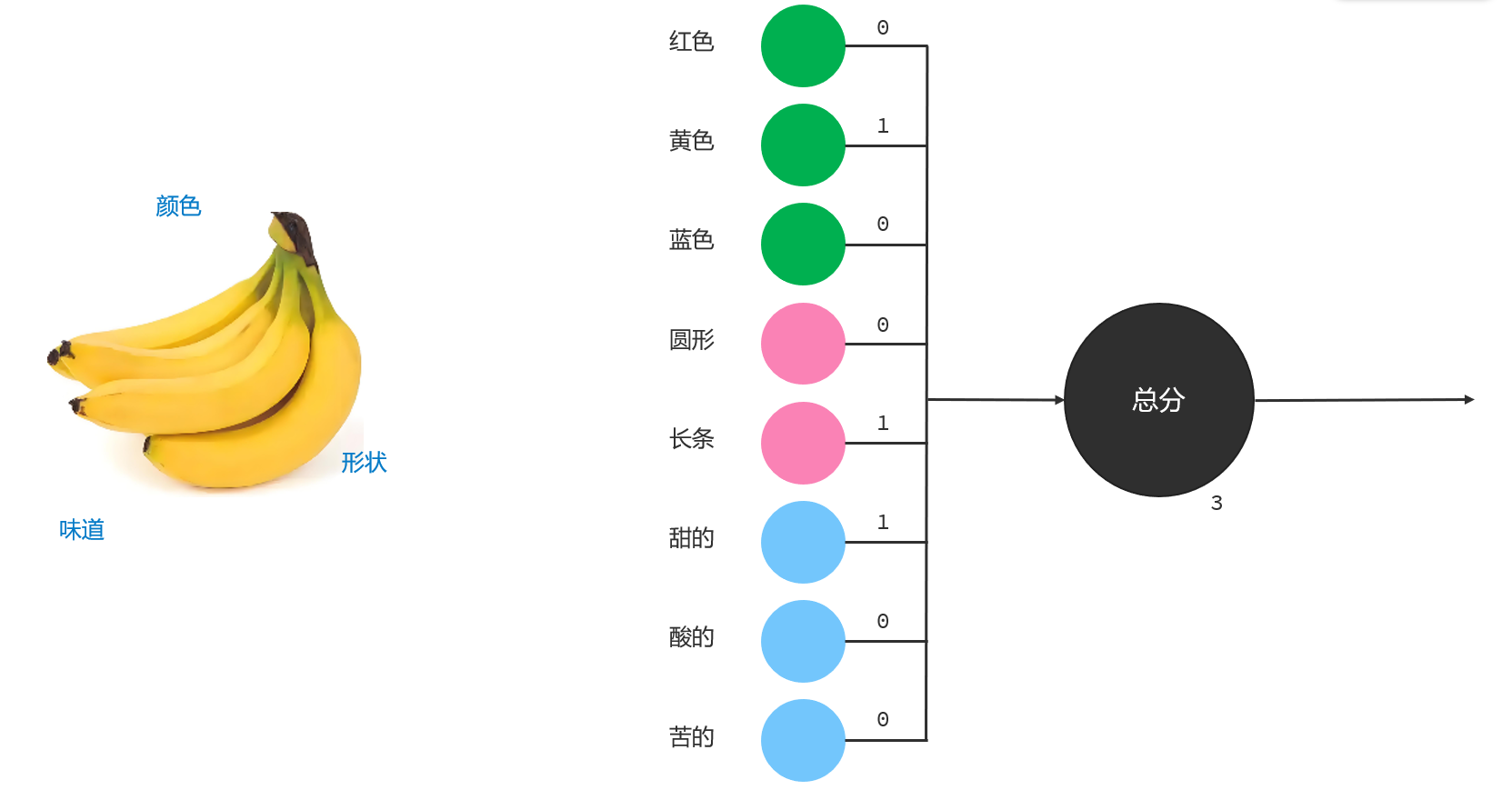 给大家举个例子,假设将来我需要设计一个感知机,用于识别水果。此时我们可以把水果的颜色、形状、味道等特征提取出来,作为感知机的输入,同时我们可以根据需求,给定不同的特征取值设置不同的权重,例如我们要识别香蕉,此时可以给黄色、长条、甜的这三个特征设置权重为1,其它特征设置权重为0。结合输入和对应的权重以及激活函数,我们可以计算出一个分数,假设我们设定一个阈值为3,如果计算的总分达到3,我们认为输入特征对应的水果就是香蕉,否则不是香蕉。