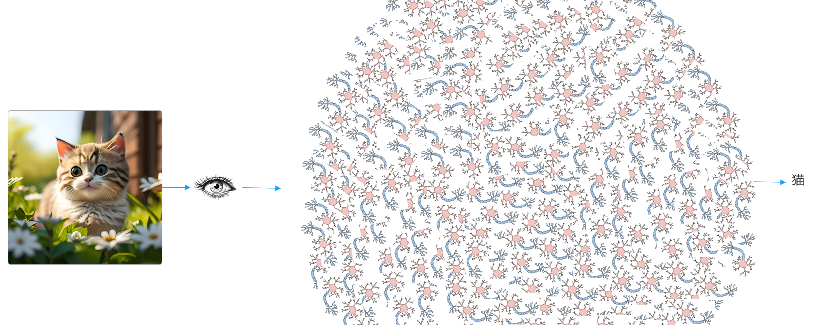 比如我们的眼睛看到了一张图片,眼睛的视网膜会将光信号转化为电信号,这些电信号会在神经元之间层层传递,经过不断地处理整合,得到最终的结论,猫!这是我们人类大脑处理信息的过程。