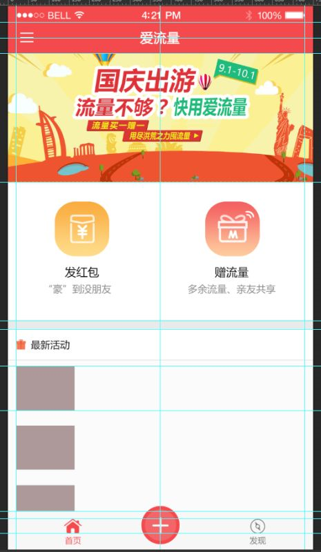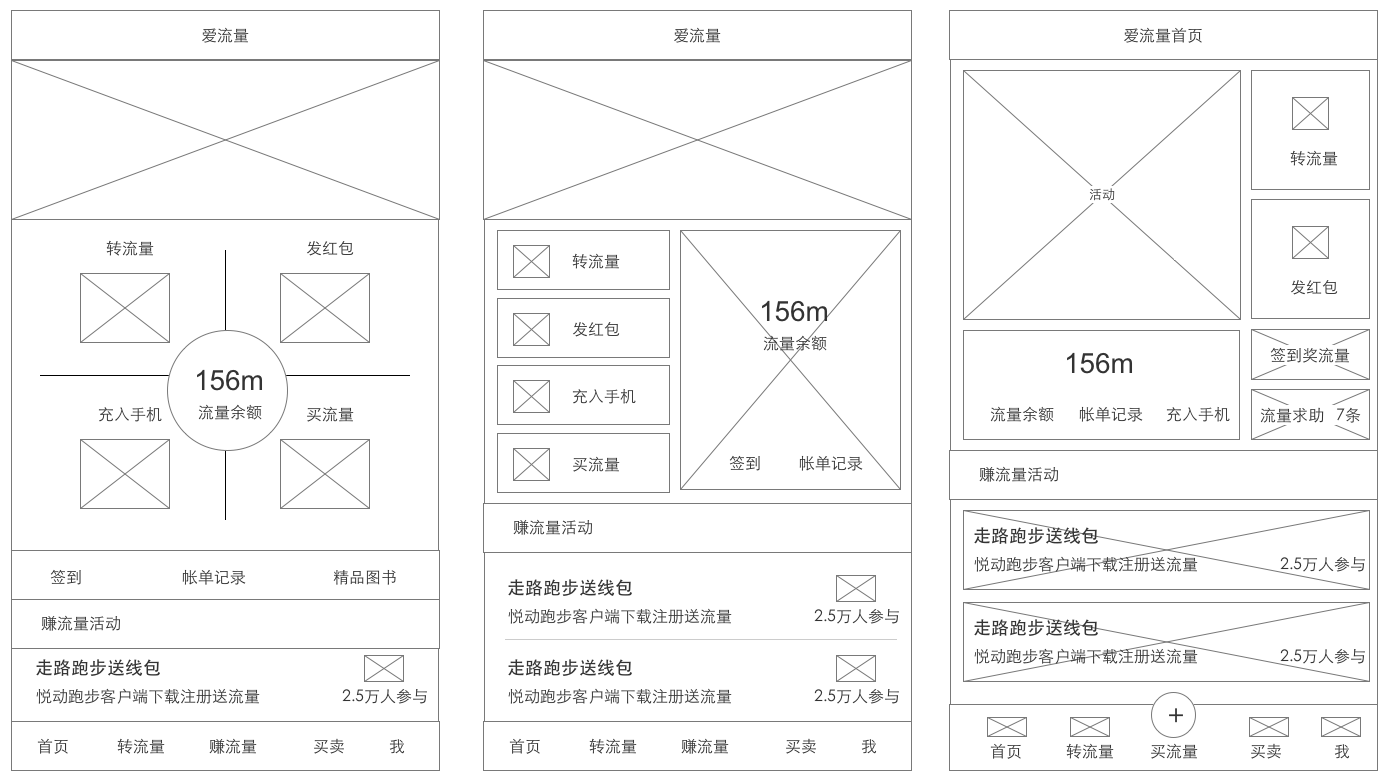 在前两版的基础上我们又加以思考、对功能的深入理解后,希望能契合产品定位并在布局和表现形式上与竞品区别,展现出爱流量的,并且经过内容的调整,增加用户的粘性,所以我们设计了第三版,首页重新布局,设计了三版交互原型。