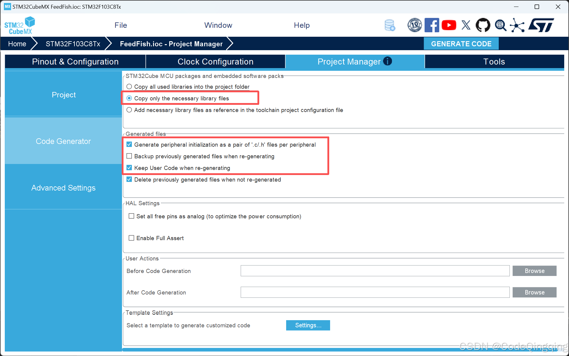 stm32cubemx 设置各基础配置,确定配置完成后,如下图进行设置: