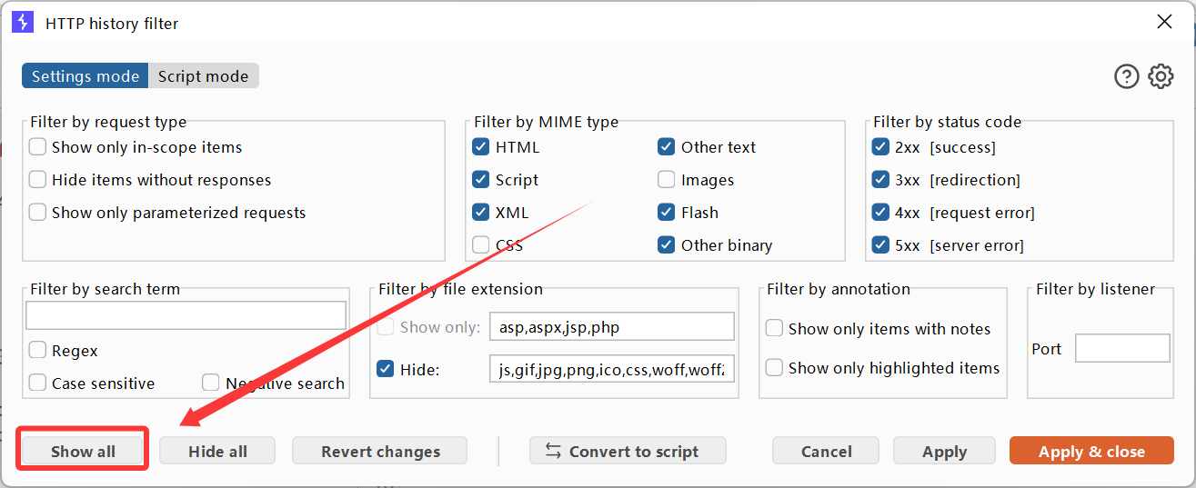 .jpg或.png(例如远程加载头像)。Burp 默认会过滤图片包以保持流畅。如果关闭该显示,你将无法在历史记录中观察到关键的 SSRF 参数请求,导致"灯下黑"。