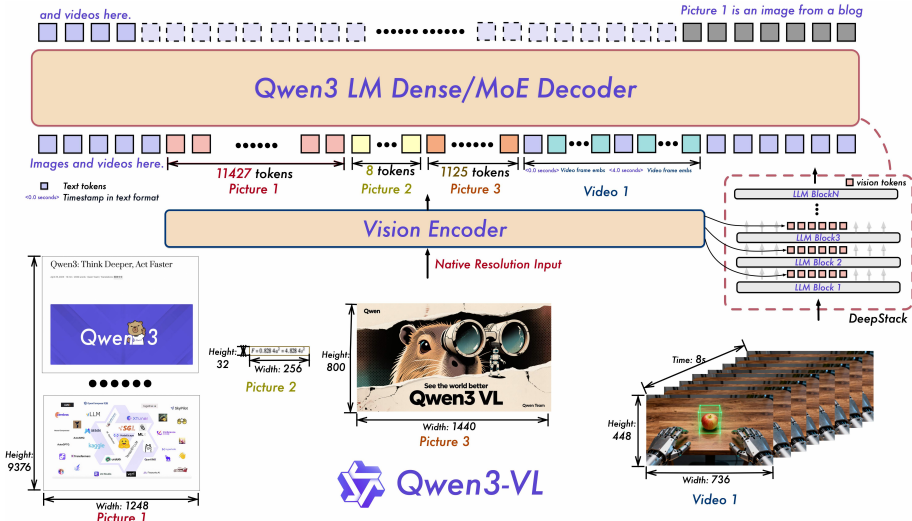 - 模型架构方面,使用DeepStack 跨层融合,提取视觉编码器多中间层特征,通过轻量残差连接注入 LLM 对应层,强化视觉-语言对齐,保留从低级到高级的丰富视觉信息。