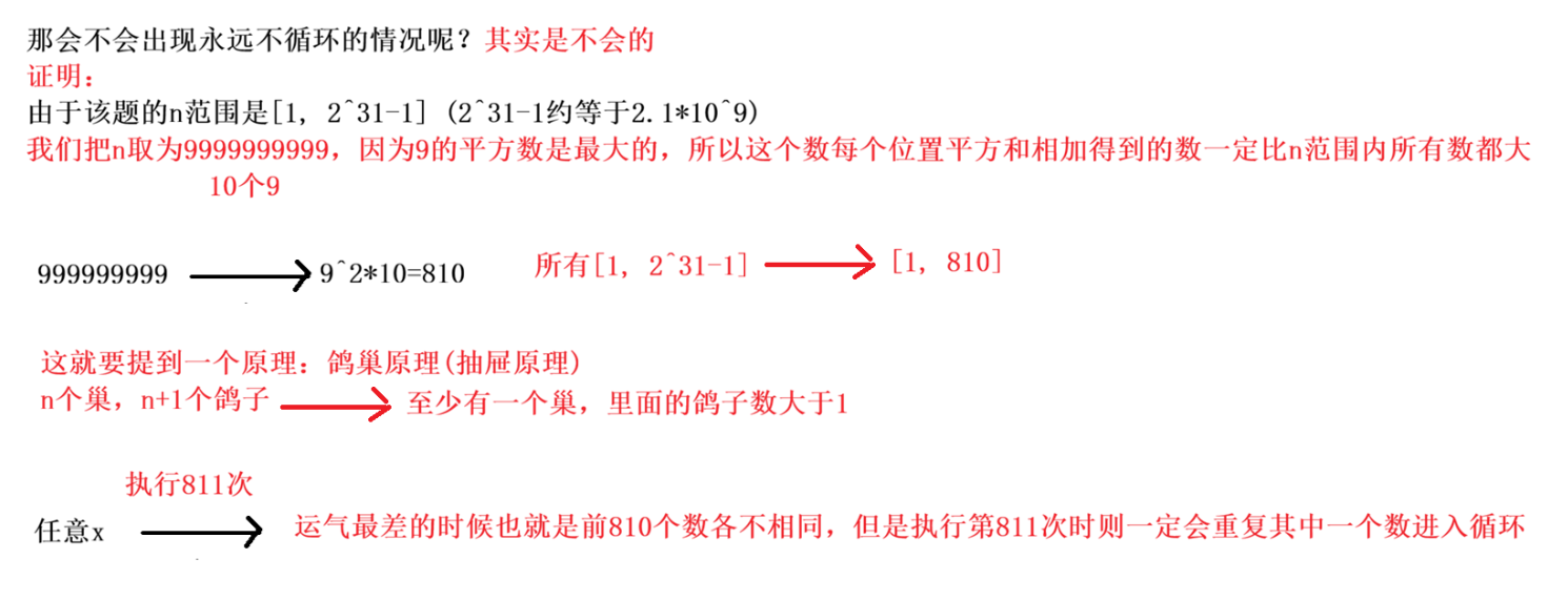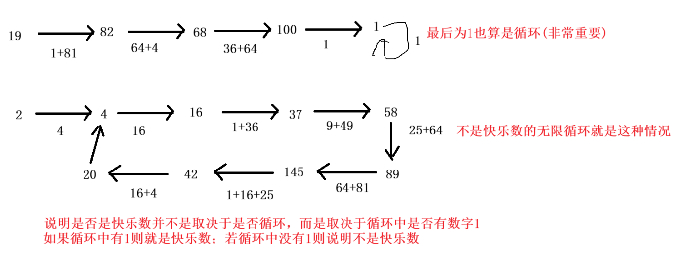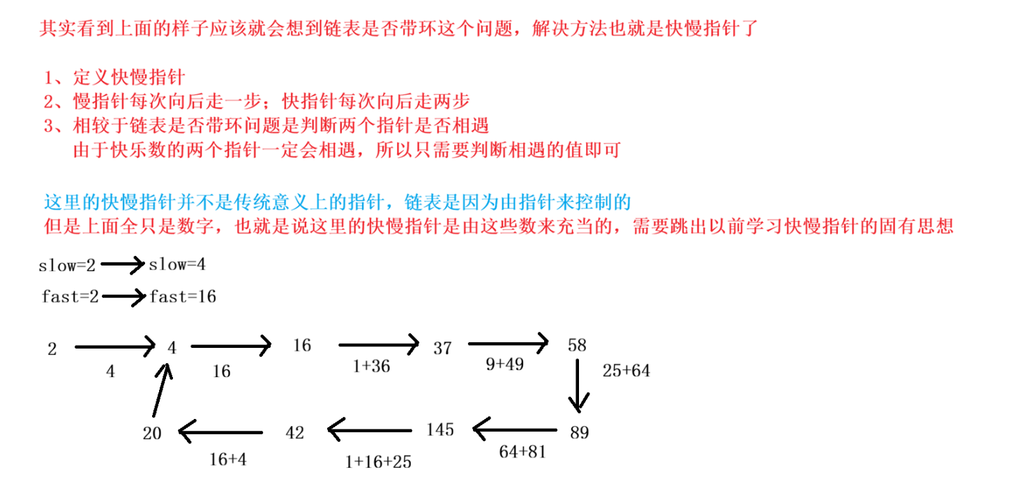 - 所以,变化的过程最终一定会走到一个圈里面,因此可以用【快慢指针】来解决。