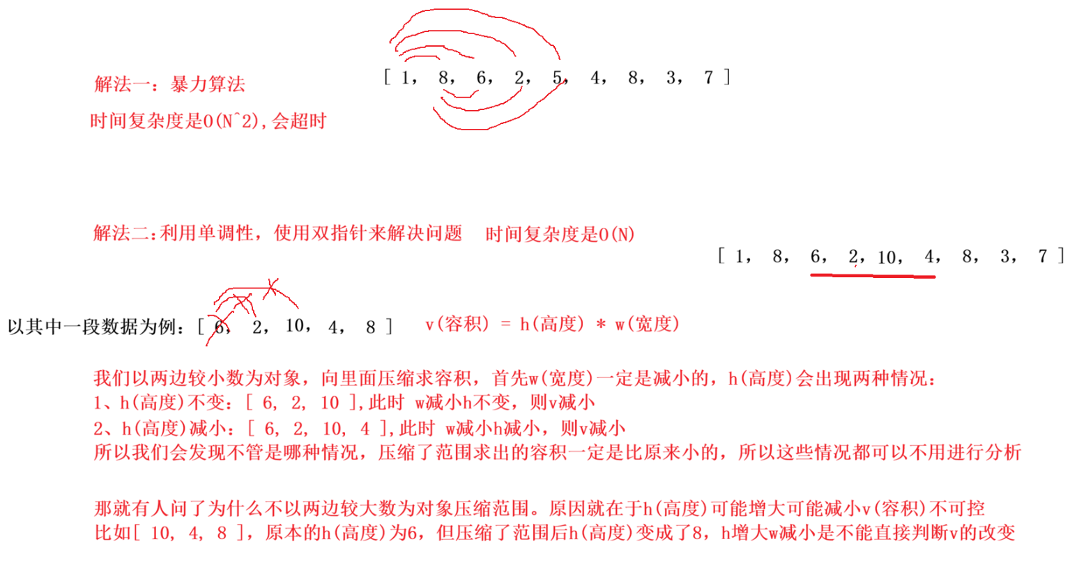 - 如果改变右边界,无论右边界移动到哪里,新的水面高度一定不会超过左边界,也就是不会超过现在的水面高度,但是由于容器的宽度减小,因此容器的容积是一定会变小的。
